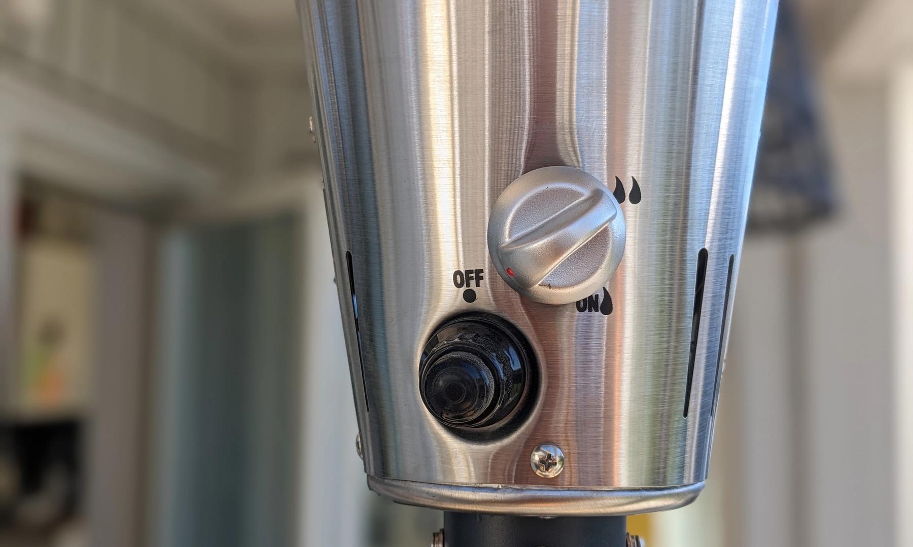 Terrassvärmaren har två knappar: en för tändningen, som fungerar med ett AA-batteri, och en regulator för värmen.