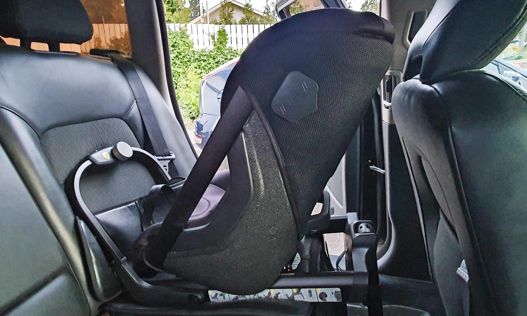 One monteras snabbt och enkelt. Först viker man ut stödbenet och sedan klickar man i isofix-fästena. Bygeln är självåtspännande och behöver bara justeras till lite, det gör man genom att vrida på ett hjul på bygeln och då spänns den hårdare mot sätet. Sedan är det bara att fälla ner sista biten på stödbenet och så sitter stolen på plats!