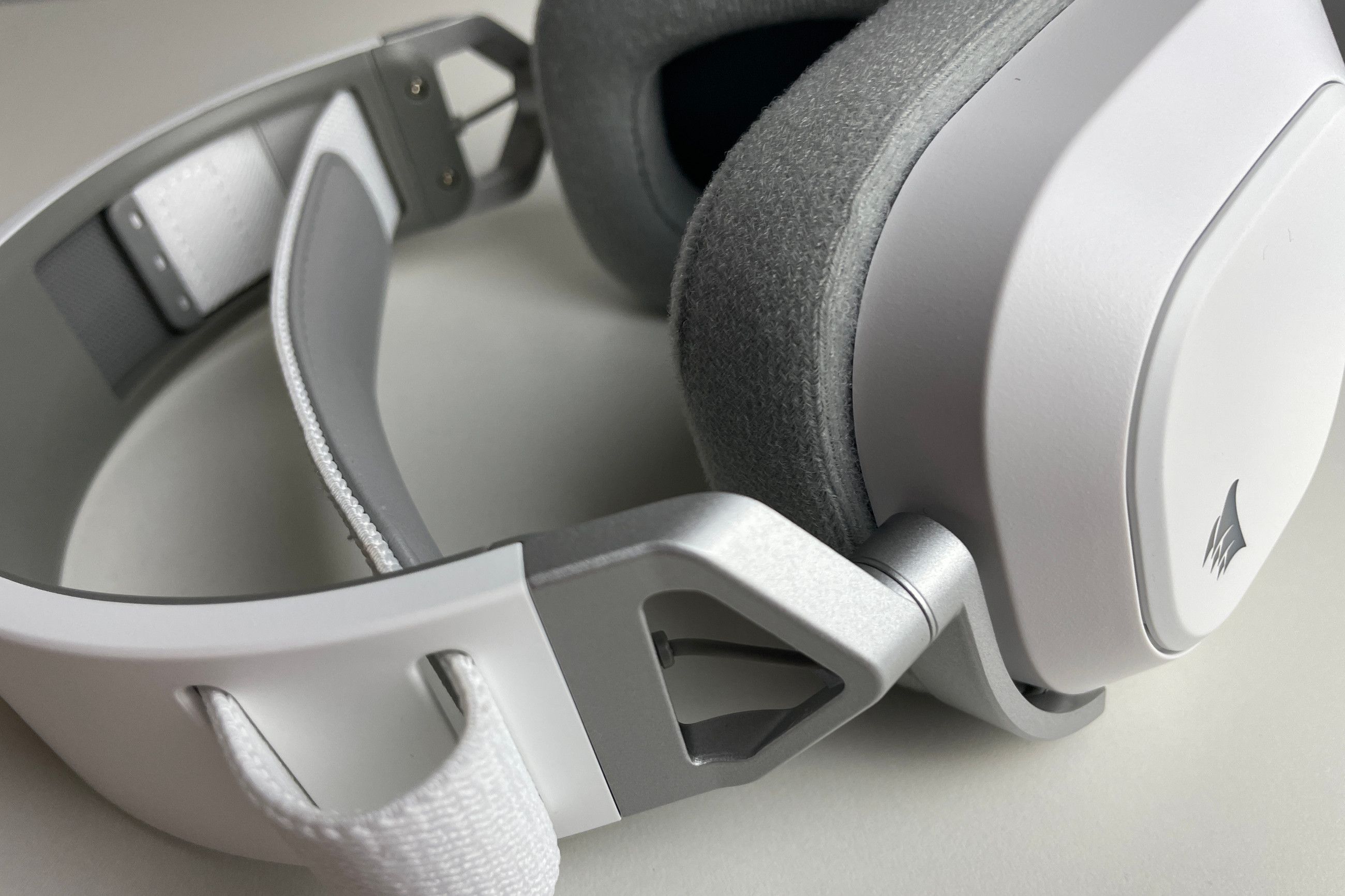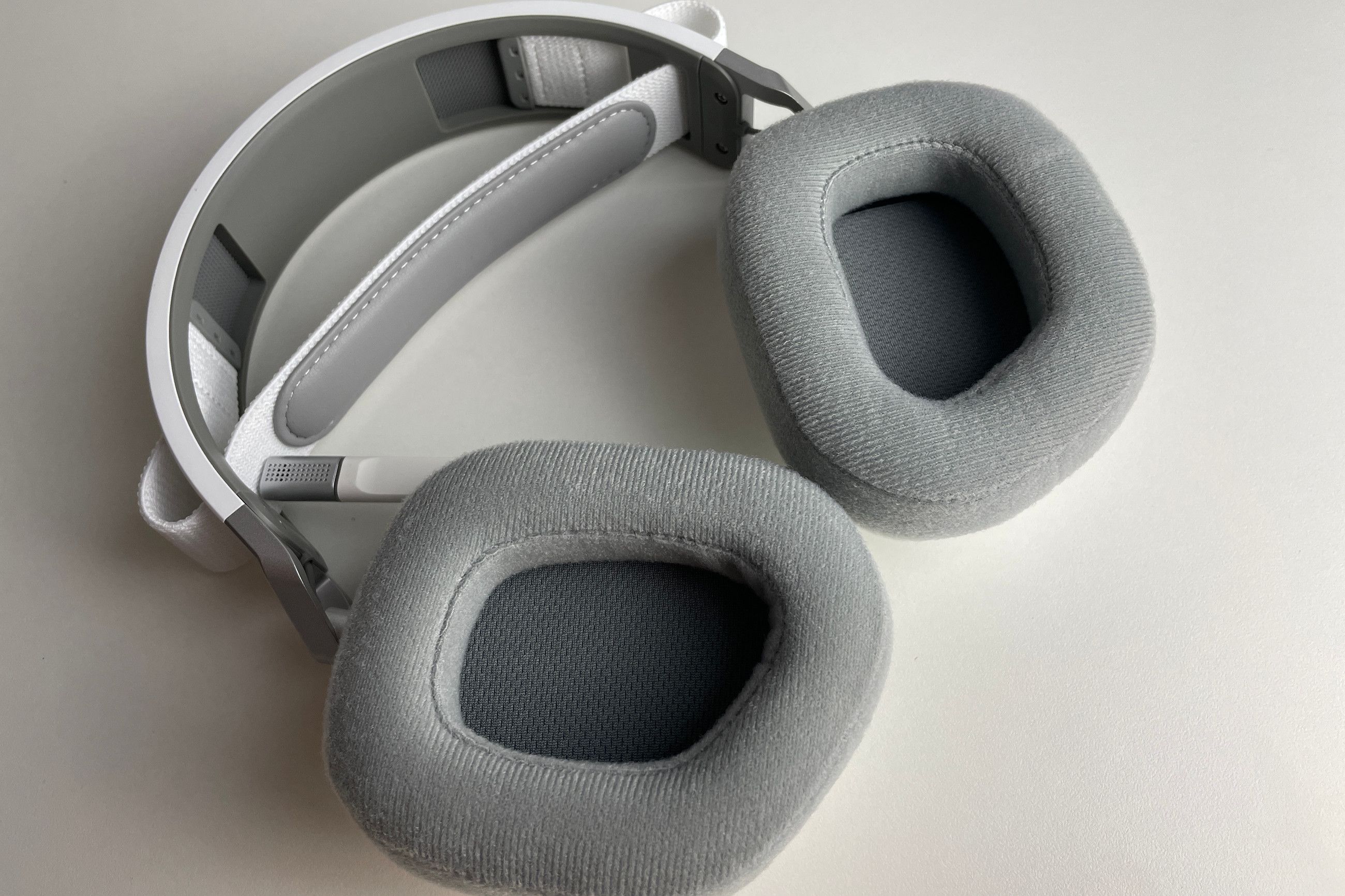 Jag tycker att Corsairs val av sätt för att kunna ställa storleken på HS80 Max känns lite udda. I många fall brukar det enbart vara att "dra ut" ramen som brukar vara av "teleskop"-funktionalitet. I det här fallet har man istället valt ett spännband som vilar ovanpå huvudet och ju mer man spänner detta, ju högre upp hamnar hörlurarna.