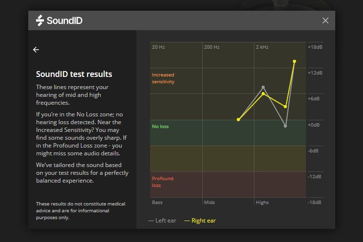 I mjukvaran iCue finns en funktion som heter "SoundID Personalization". En för mig, ganska unik funktion som genom ett kortare ljudtest optimerar ljudet för just din hörsel. I slutet får jag även sammanfattning om hur jag uppfattar ljud på olika frekvenser som jag tyckte var intressant. Mitt resultat visar till exempel att jag har ökad känslighet för medel och höga frekvenser och har inga tecken på dålig hörsel som missar olika detaljer.