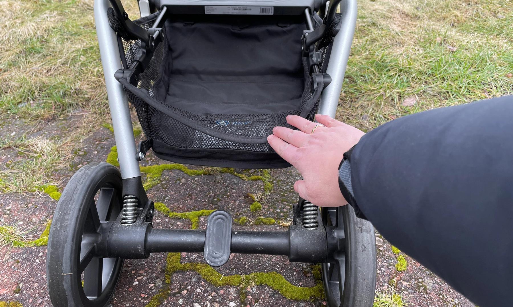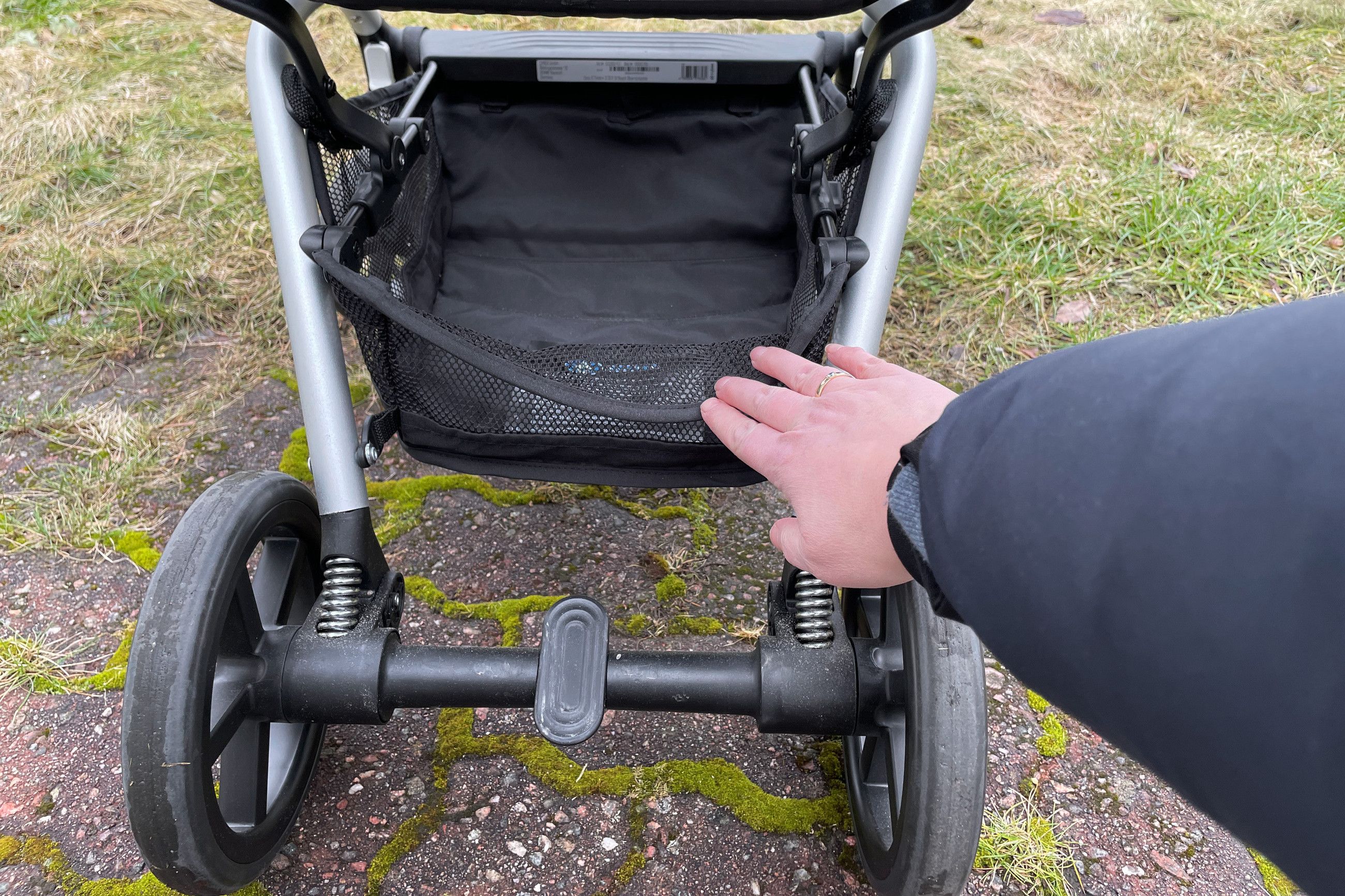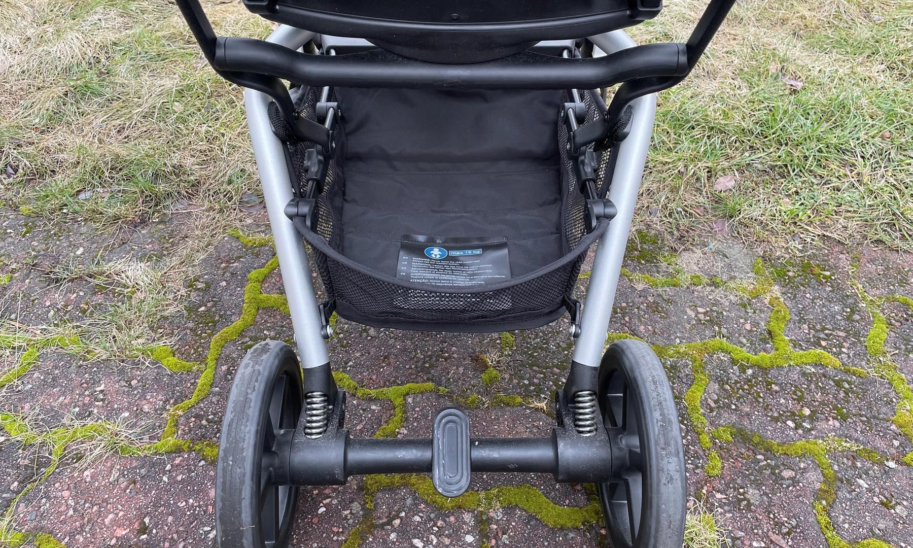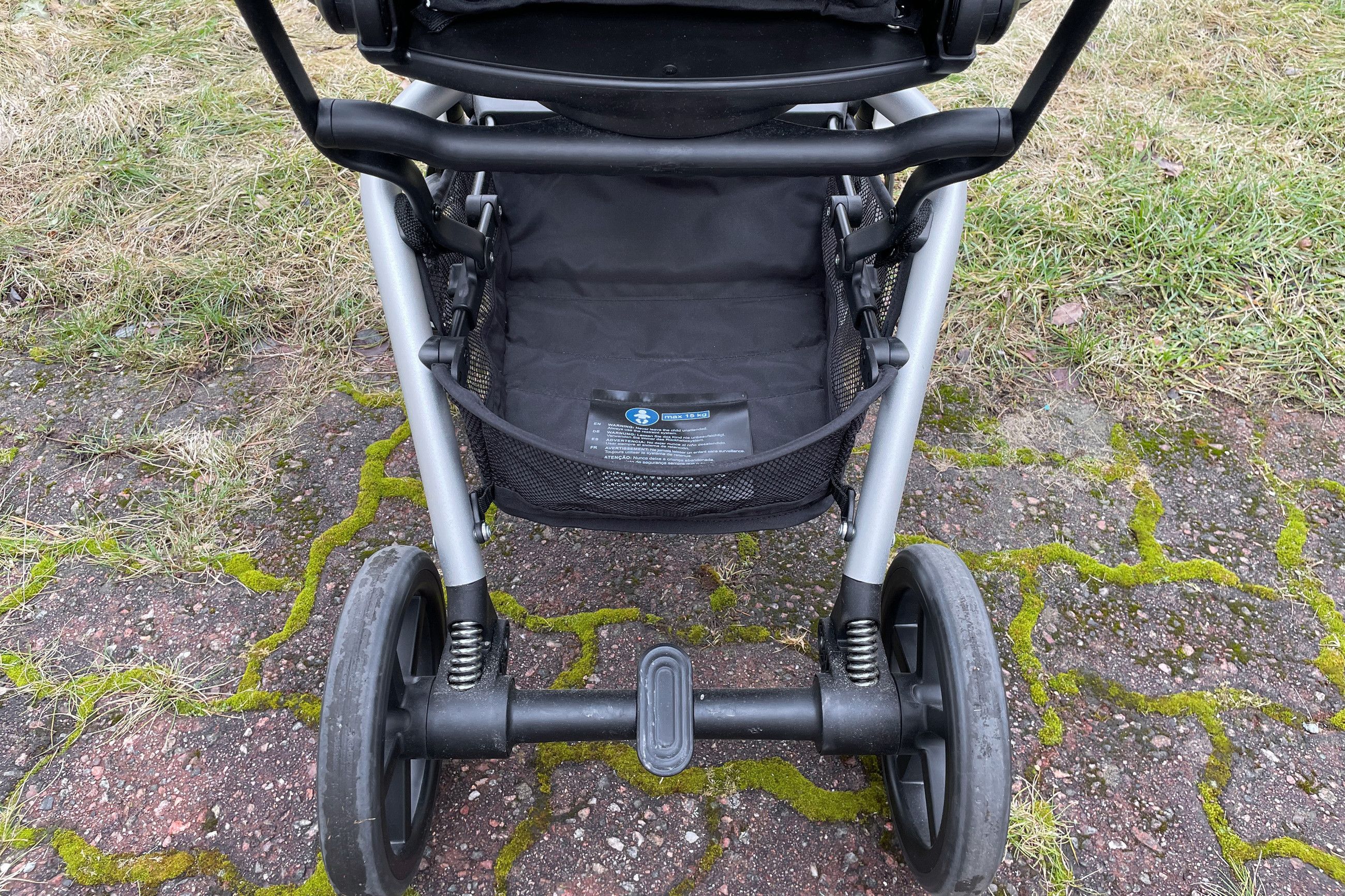 Varukorgen är rymlig för att vara en så pass kompakt vagn. Maxvikten på den är 5 kg och den har relativt höga kanter. Det har aldrig varit något problem med plats när vi varit på resande fot eller handlat.