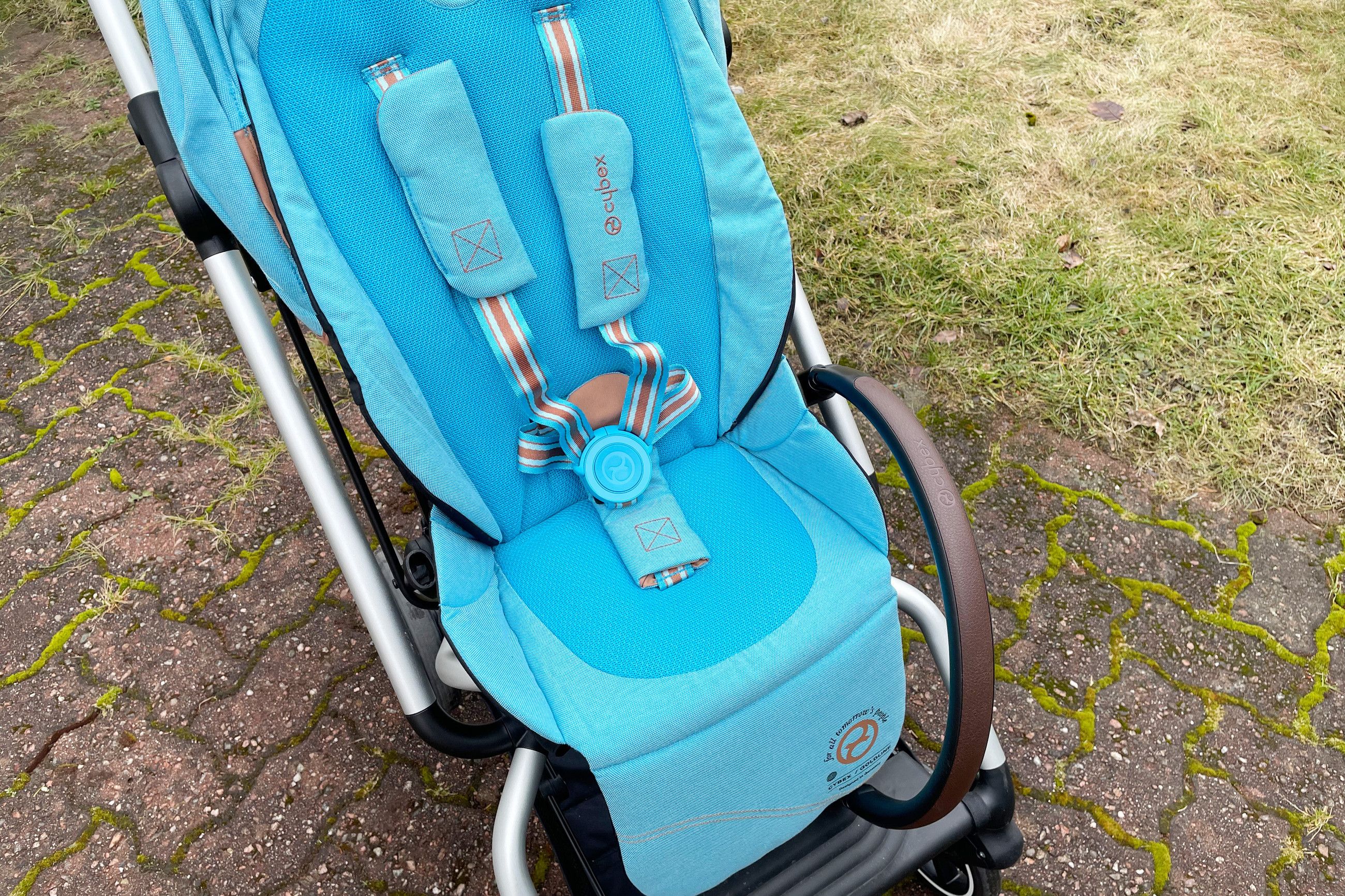 Sittdelen är bekväm och har skydd på sidorna. Jag hade önskat något högre sidoskydd då den känns lite öppen på sidorna. Sittdelen har en fempunktsele, men den öppnas via tre fästen, axel- och midjeremmen sitter ihop och går inte att dela.