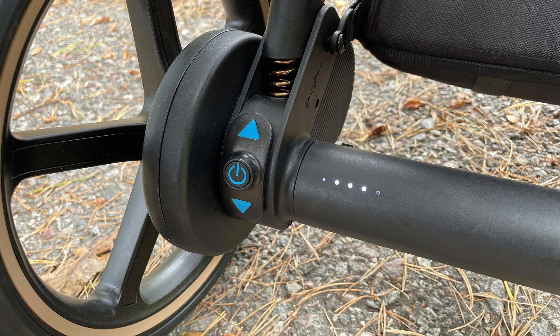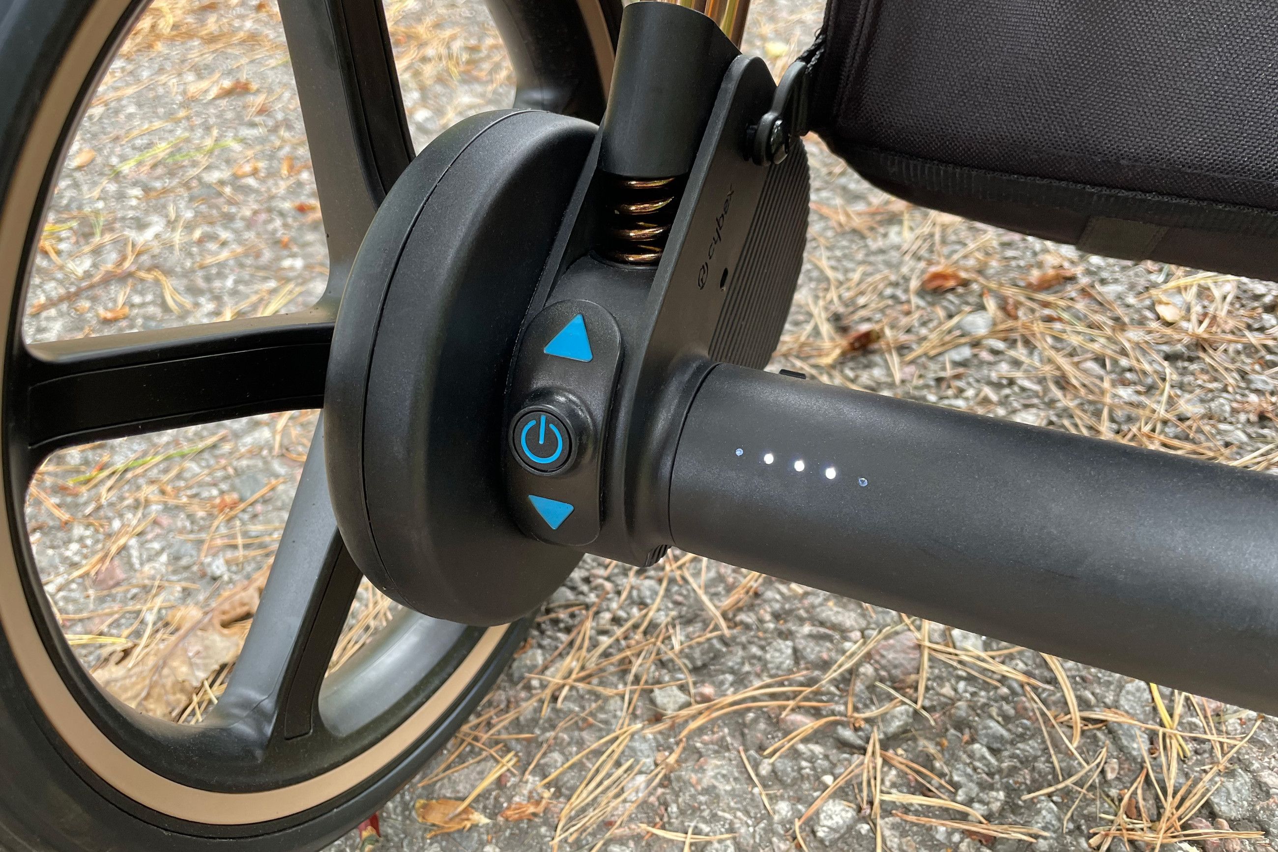 Cybex e-Priam funkar verkligen som tänkt och ger en otroligt bra hjälp i backar och kuperad terräng. Elmotorn drar vagnen uppför i uppförsbackar och håller emot/bromsar i nedförsbackar. Den känner även av när man går i lite terräng. Den hjälper då till att trycka på lite extra när vägen är kuperad på grund av rötter eller om det t.ex. är kullersten på vägen.