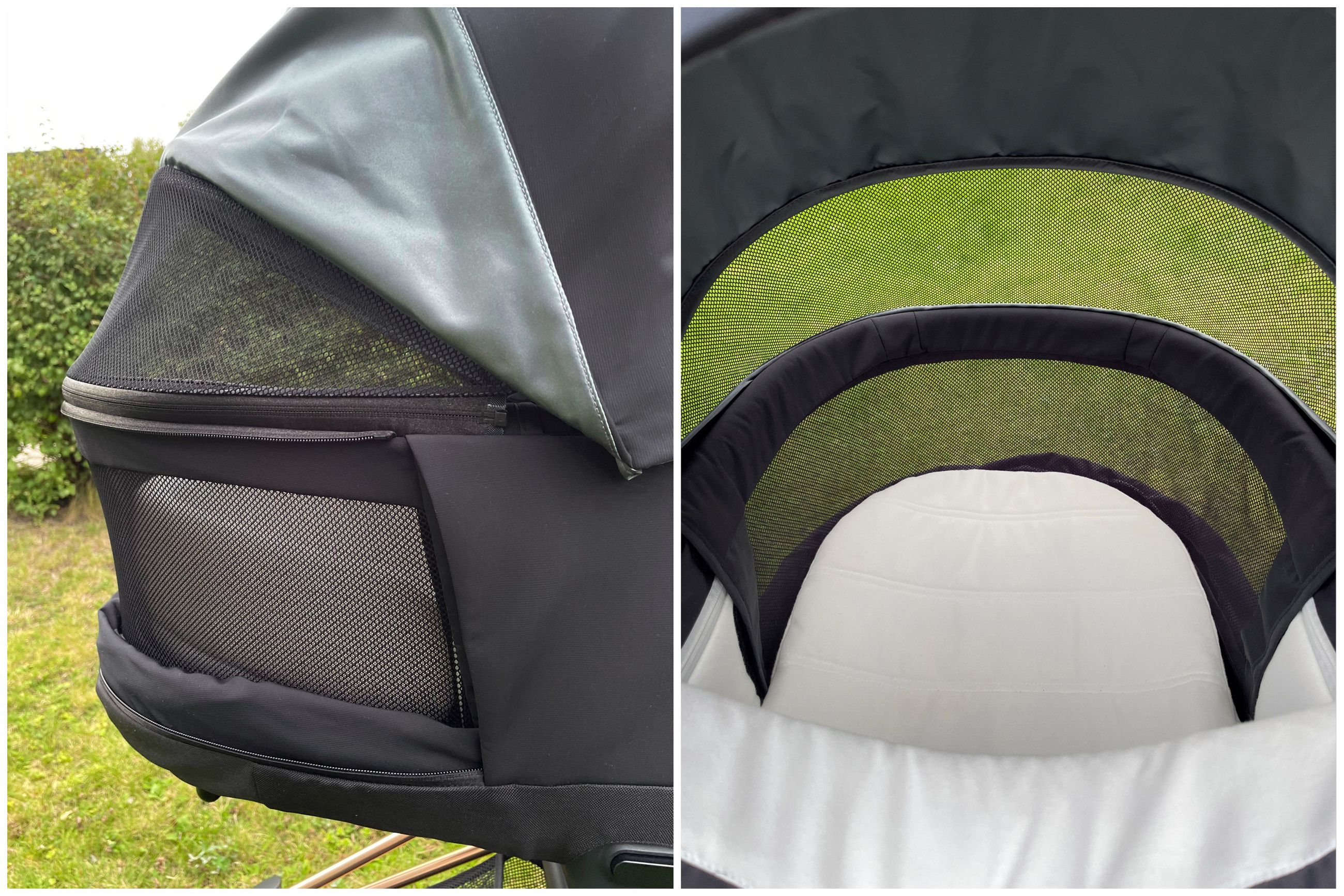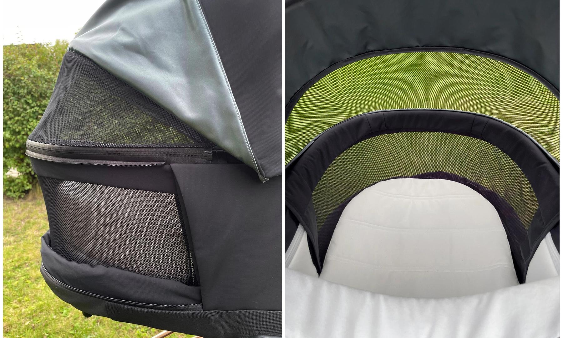 Liggdelen har en ventilerad botten. Suffletten har en liten solkeps vilket skyddar mycket bra för sol och även vind. Sufflettens nederdel samt huvudändans tyg går att ta bort så ventilationen blir väldigt bra samt går att variera på många sätt. Har man ett barn som gillar att ligga på mage och titta ut så går det också alldeles utmärkt i Priams nya liggdel.