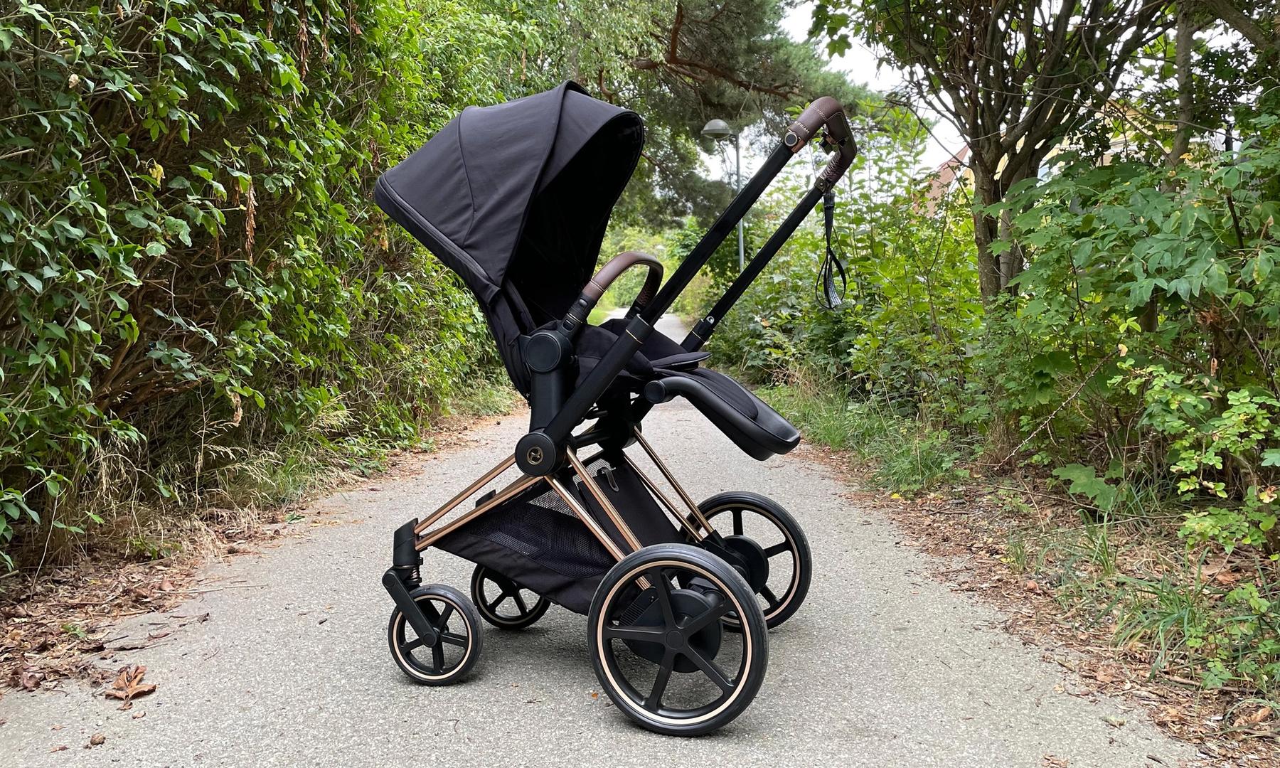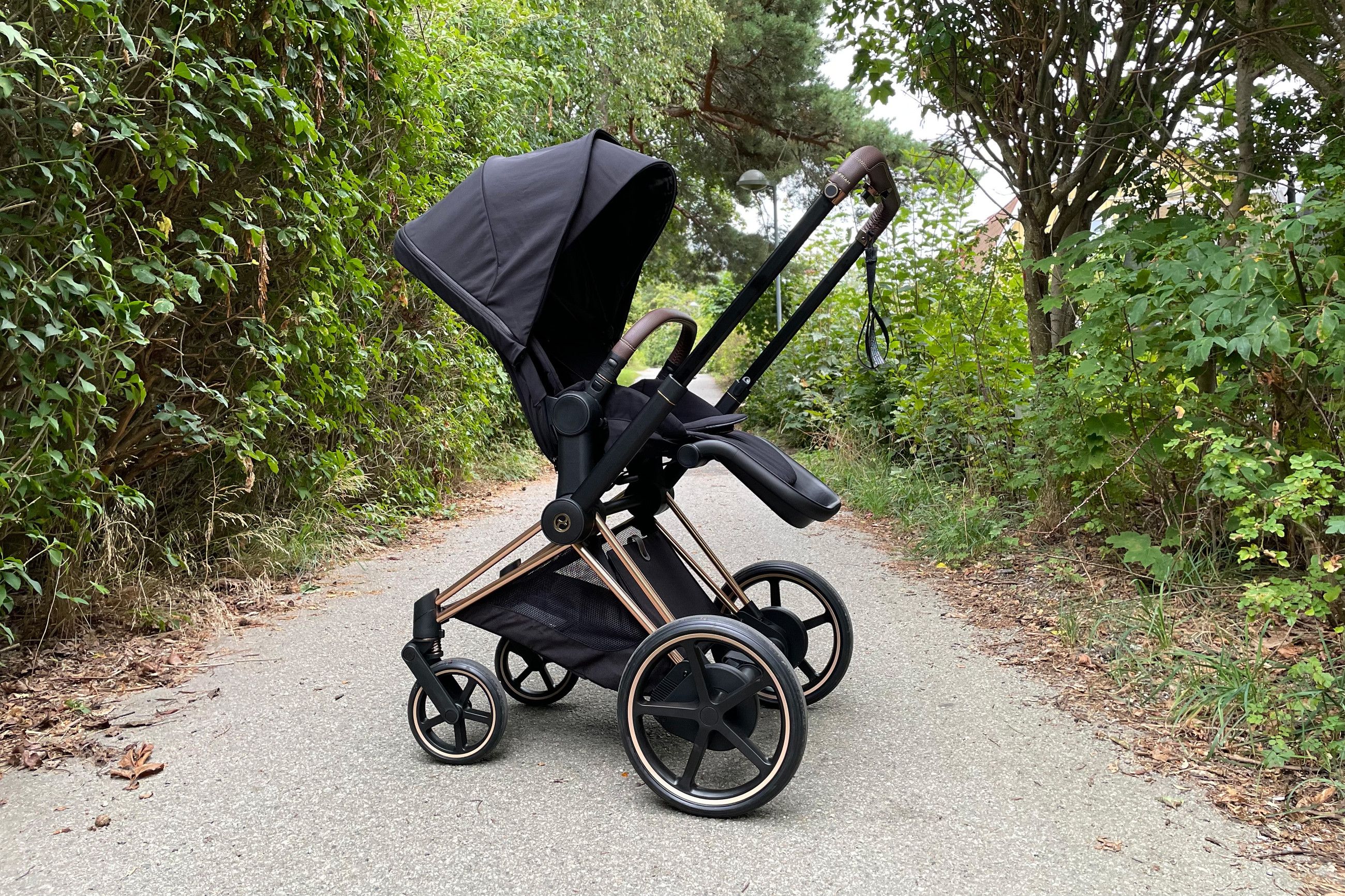 e-Priam är en riktigt snygg vagn med smakfull design. Chassit har raka linjer vilket jag verkligen gillar. Vagnen vi har rullat är i färgen roséguld där även de punkteringsfria hjulen har en smal rand i samma fina färg.