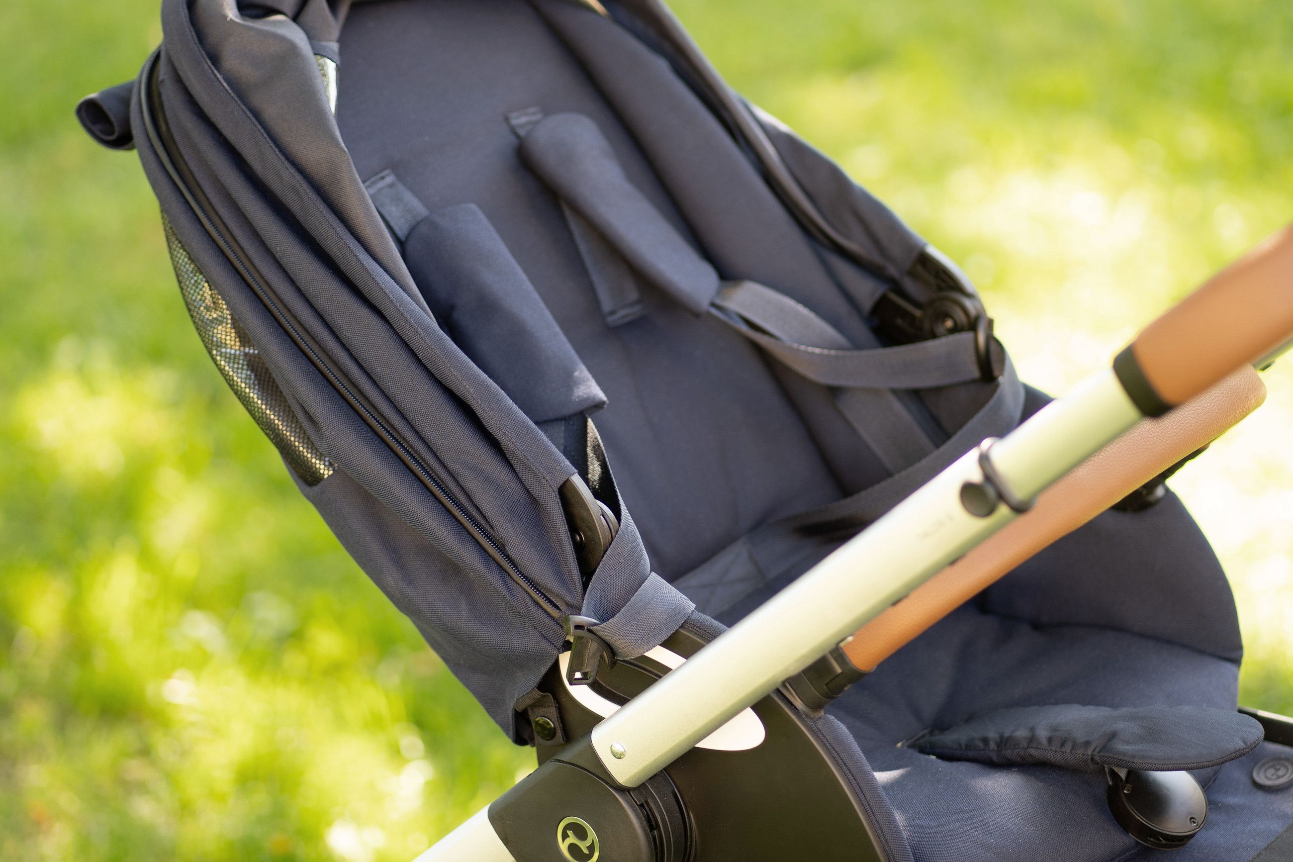 Sittdelen är otroligt mysig! Den är mjuk och ombonad, har en bra sele och en jättebra sufflett. Den får också ett stort plus för att den har ställbart fotstöd och fullt liggläge. Tänk att få ligga där inne och mysa med suffletten uppfälld och fullt panoramafönster.