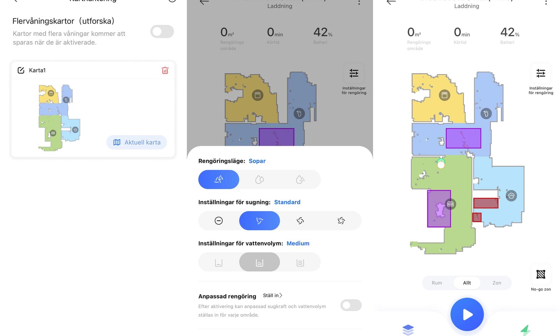 Instruktionerna är tydliga när du skall ansluta dammsugaren till ditt WiFi. Vid första användning får du frågan om du vill att dammsugaren skall köra en kartläggning (mapping) av våningsplanet. Väljer du ja så kör dammsugaren runt på våningsplanet med endast LiDAR (lasernavigering) igång och ritar upp kartan åt dig. När det är klart kan du redigera kartan genom att lägga in "no mop zone" och "no go zone" samt välja rumsindelning av våningsplanet.
