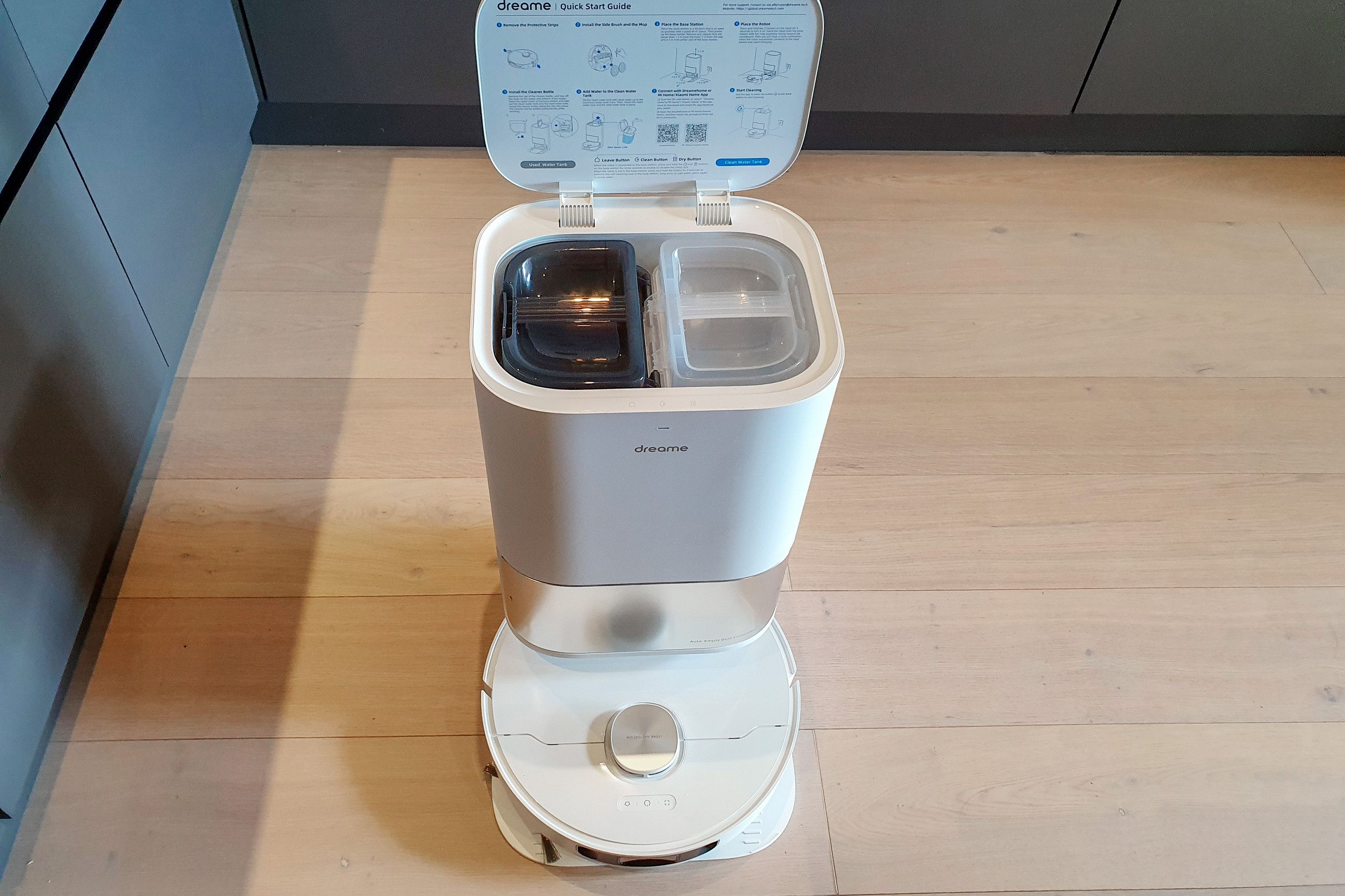 Mellan stationens två vattenbehållare sitter en liten behållare med rengöringsmedel som blandas med vattnet innan det pumpas över i roboten.