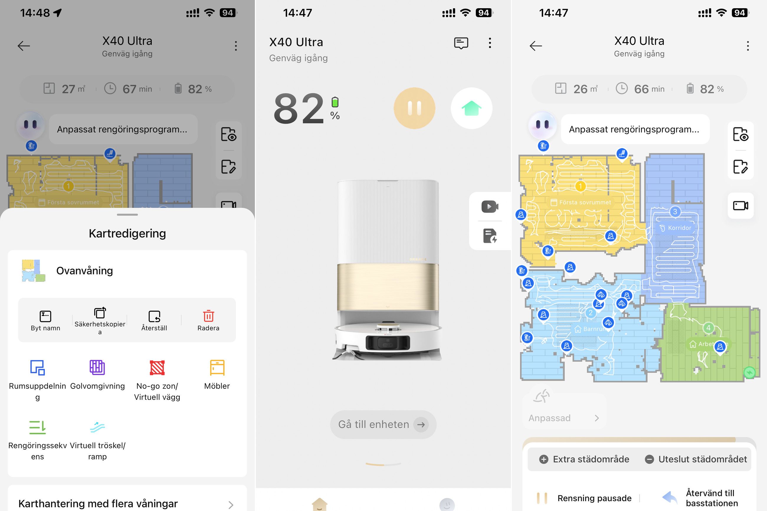 X40 Ultra har i övrigt de vanliga sensorerna för att undvika trappor, avstånd till väggen och såklart lasernavigering. Med hjälp av lasernavigeringen tar det bara några minuter för roboten att rita upp och kartlägga våningsplanet. Med hjälp av kameran och den inbyggda AI funktionen så kan X40 Ultra avgöra vilket som är bästa städprogrammet beroende på hur smutsigt golvet är. Självklart man kan även styra själv i appen vilket städprogram som är lämpligt.