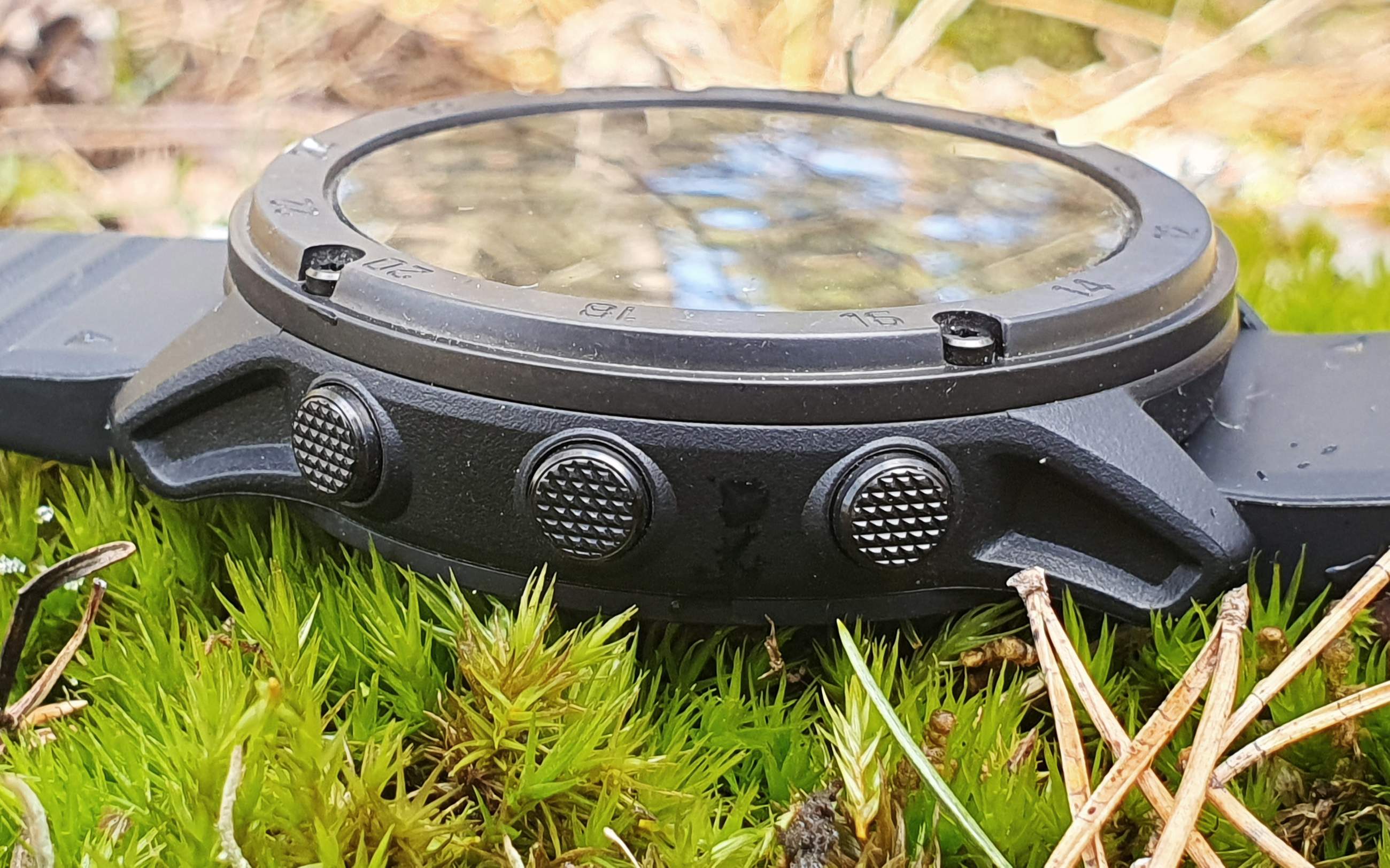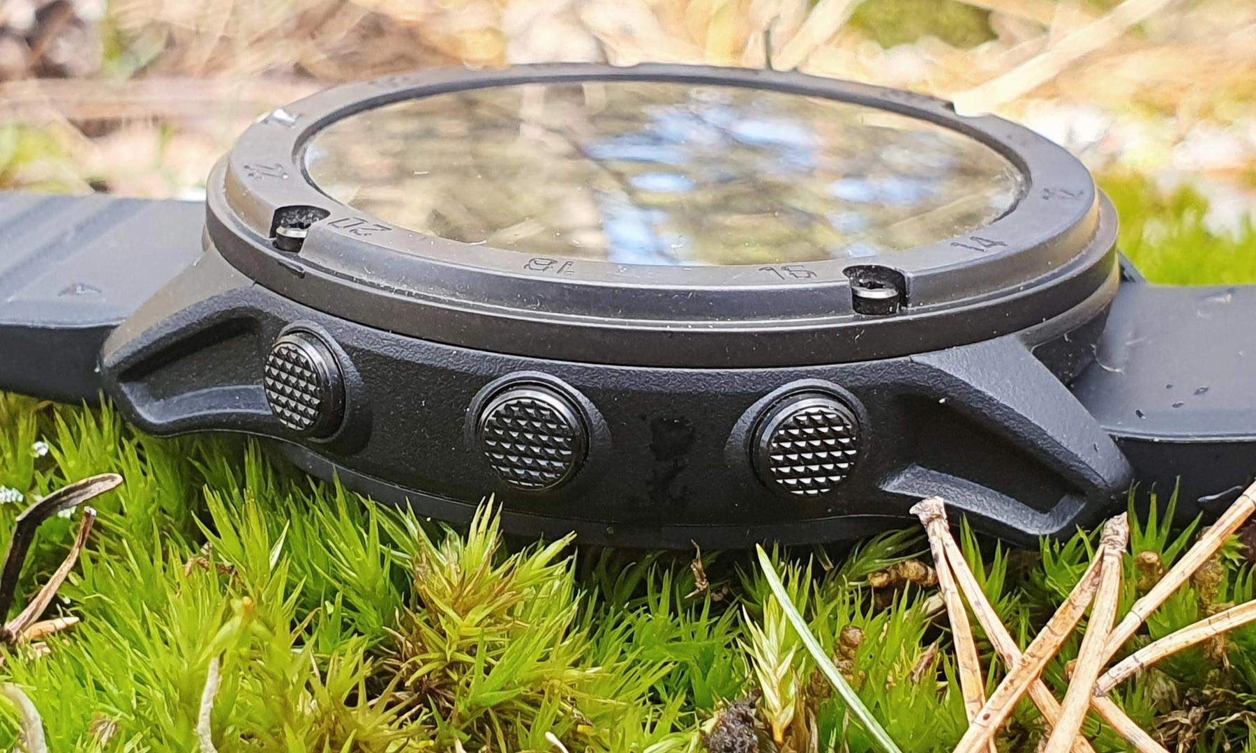 Något som i min taktiska värld är ett stort plus är att det inte är en touchskärm. Ja du läste rätt, det är en smartklocka med traditionella tryckknappar på sidorna. Stora och greppvänliga knappar dessutom. Funkar bra med handskarna på, det gör inget om det regnar på skärmen och man kan känna knapparna och starta funktioner utan att se på klockan.