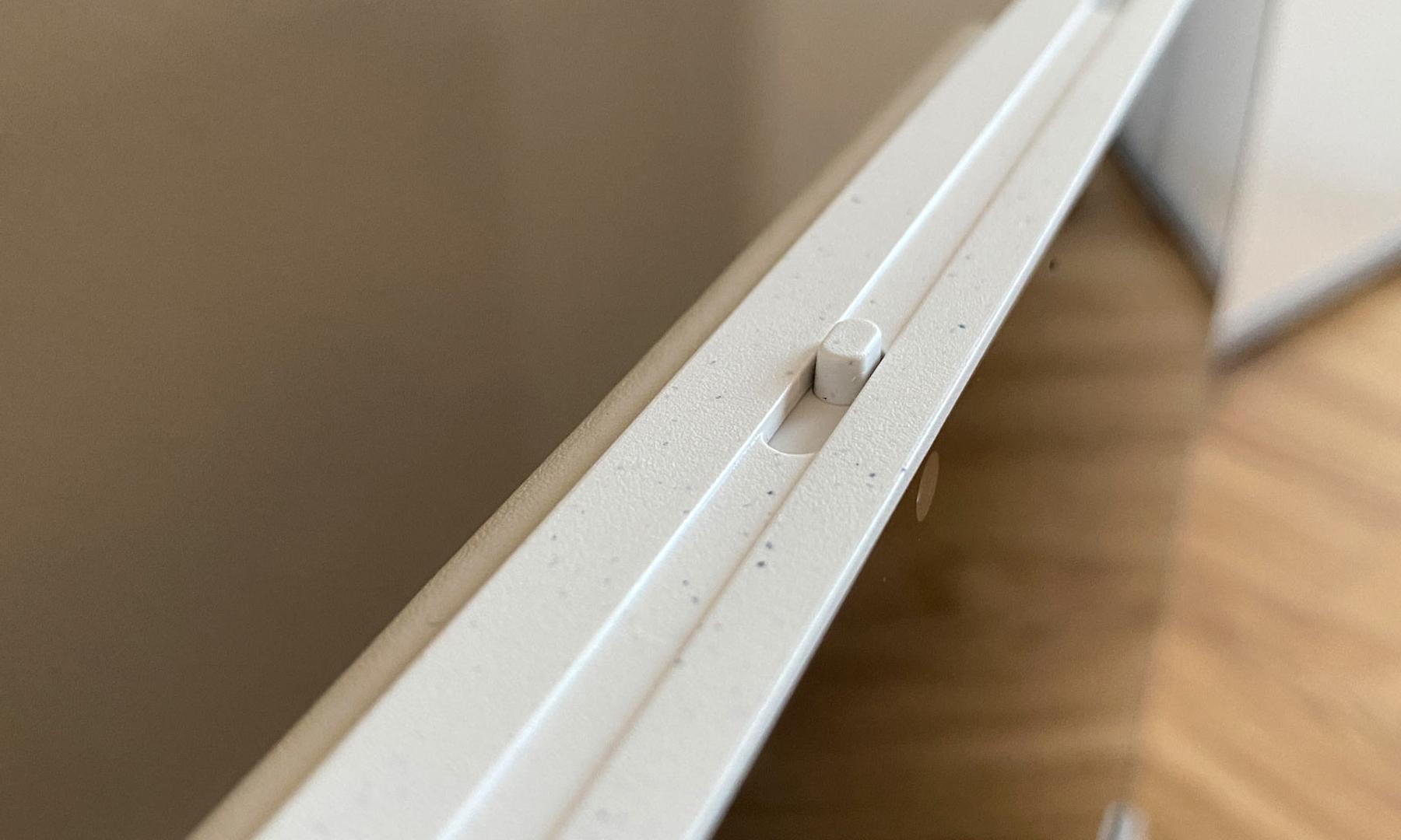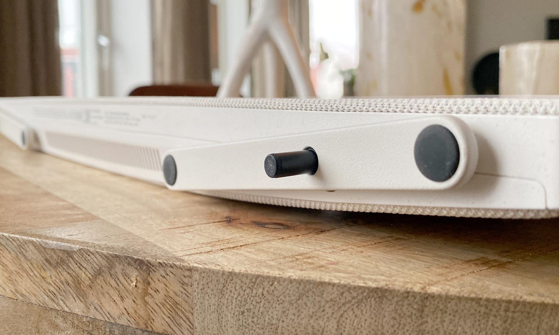 Vi börjar högst upp. Där finns det nämligen ett litet handtag som snäpper fast med magneter på baksidan när det inte används. Lyfter man däremot i handtaget följer hela datorn snällt med upp och de två små benen längst ned snurrar automatiskt in och placerar sig parallellt med själva datorn. När datorn ställs ned igen snurrar benen direkt ut och gör att allt står stabilt. Så förbaskat kul funktion ärligt talat. Fungerar bra gör den med.