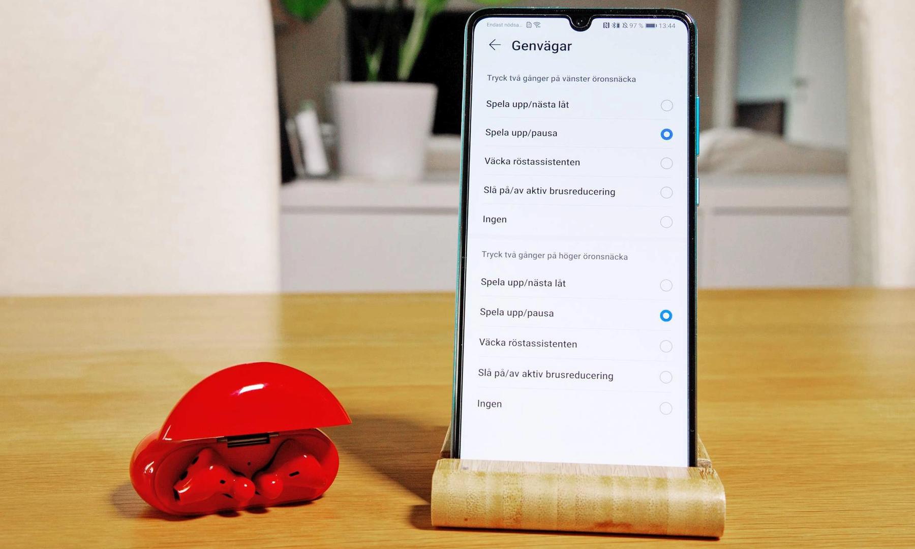 Med appen kan du göra ändringar i hur tryckningar på hörlurarna skall fungera, exempelvis välja om det ska vara samma funktion i båda eller om den ena skall aktivera brusreducering och den andra för start/paus/låtbyte i uppspelning. Det är även genom denna app som du får uppdateringar av hörlurarnas mjukvara så om du vill kunna förbättra dina Freebuds 3 med tiden, då gör du bäst i att använda en Android-telefon till dem. Volymkontroll finns tyvärr inte inbyggt, men mikrofon för samtal gör.