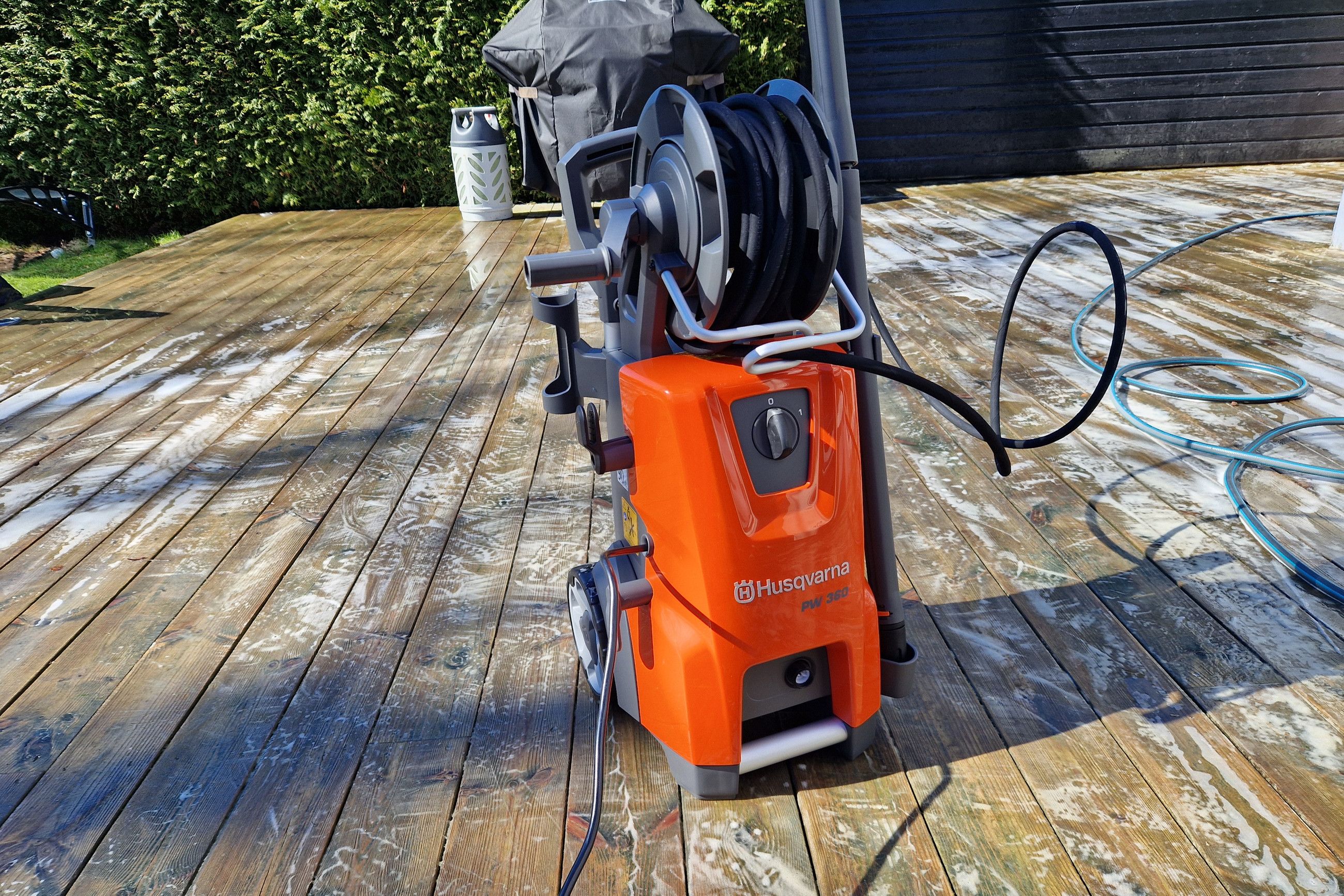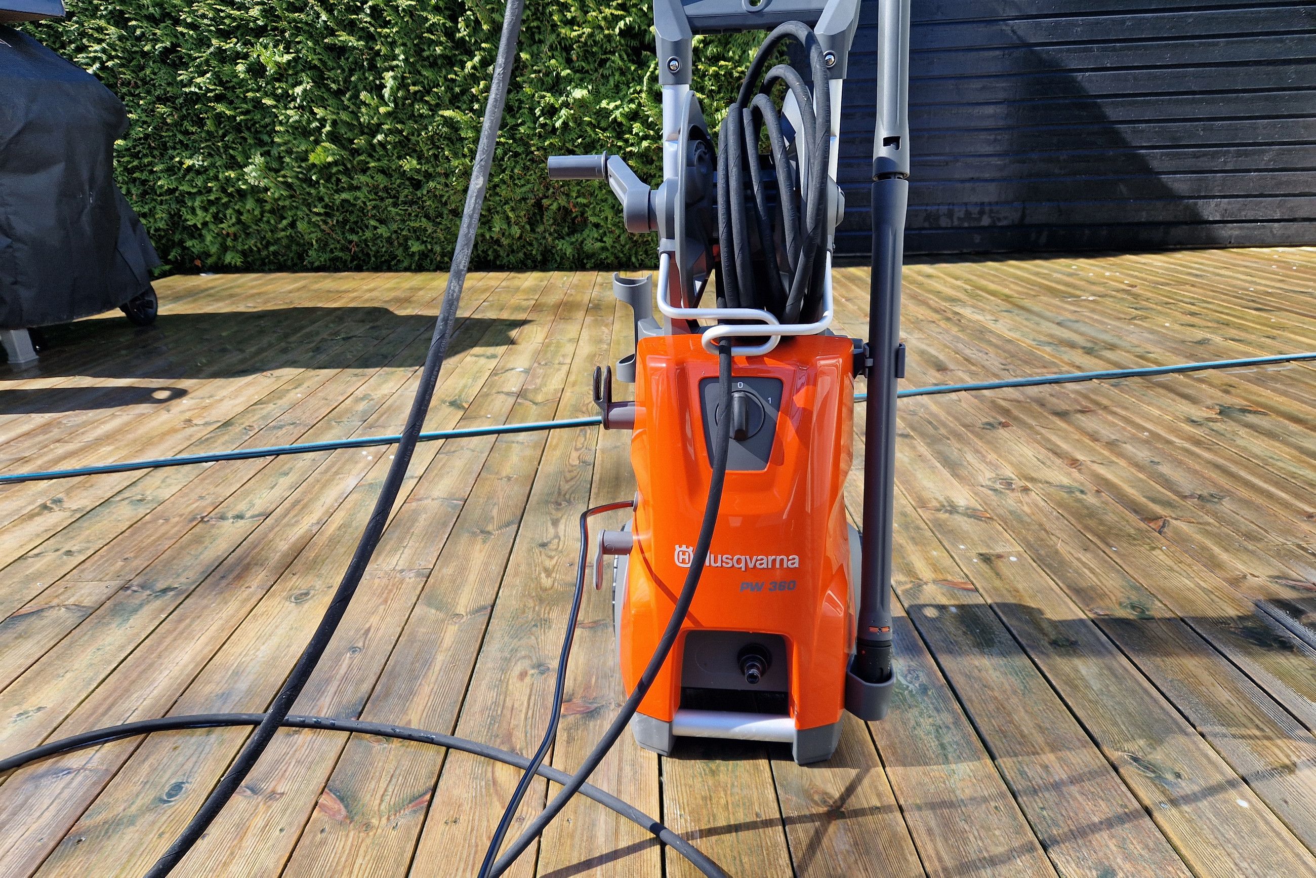 Högtrycksslangen på PW 360 är förstärkt med stål för extra tålighet. Men den är fortfarande enkel att hantera. Jag upplever att tidigare modeller har hårda och inte så följsamma slangar som gör att arbetet blir avbrutet hela tiden då du måste rätta till slangen som korvat sig eller slagit knut. Här har verkligen Husqvarna tänkt till och tagit sig uppåt i olika finesser som uppskattas av kund.