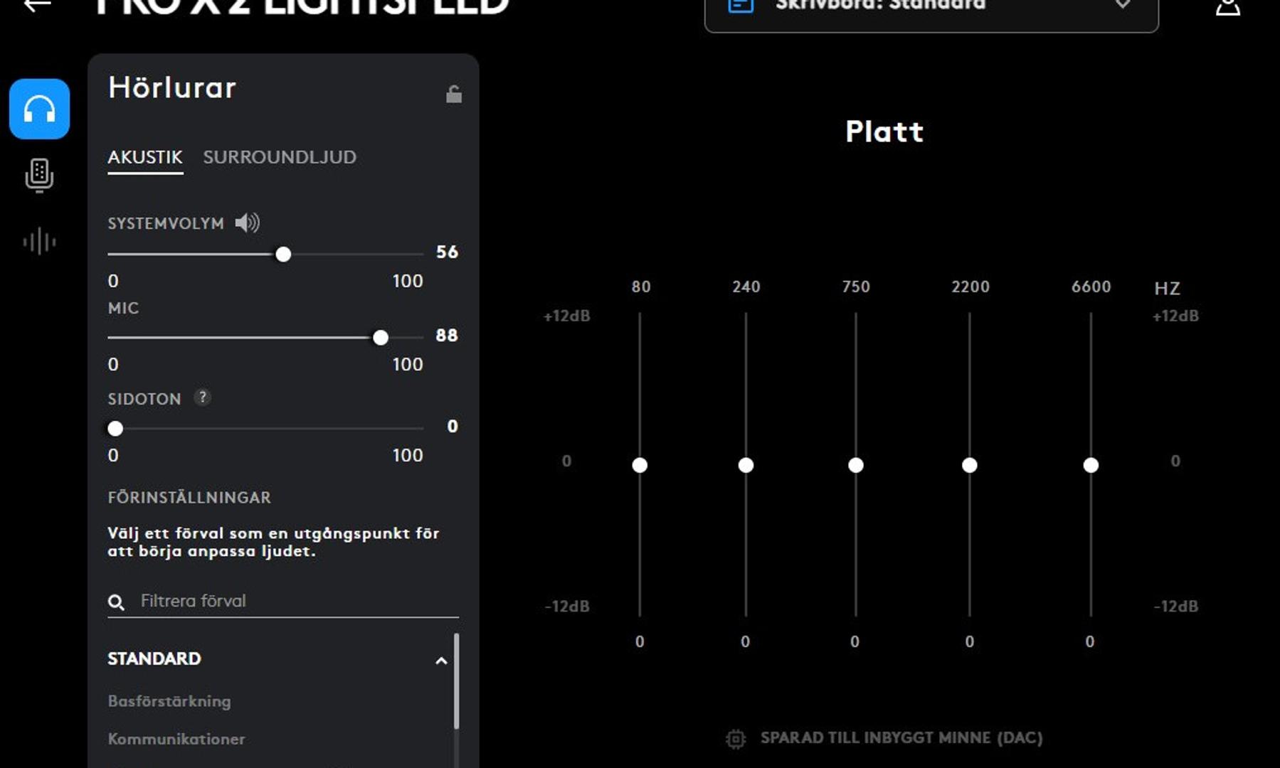 Ljudet i hörlurarna känns bra men jag kände att jag inte var nöjd med den "platta" förinställningen, men tack vare G Hub kan det enkelt ändras så som man önskar i en femstegad Equalizer.