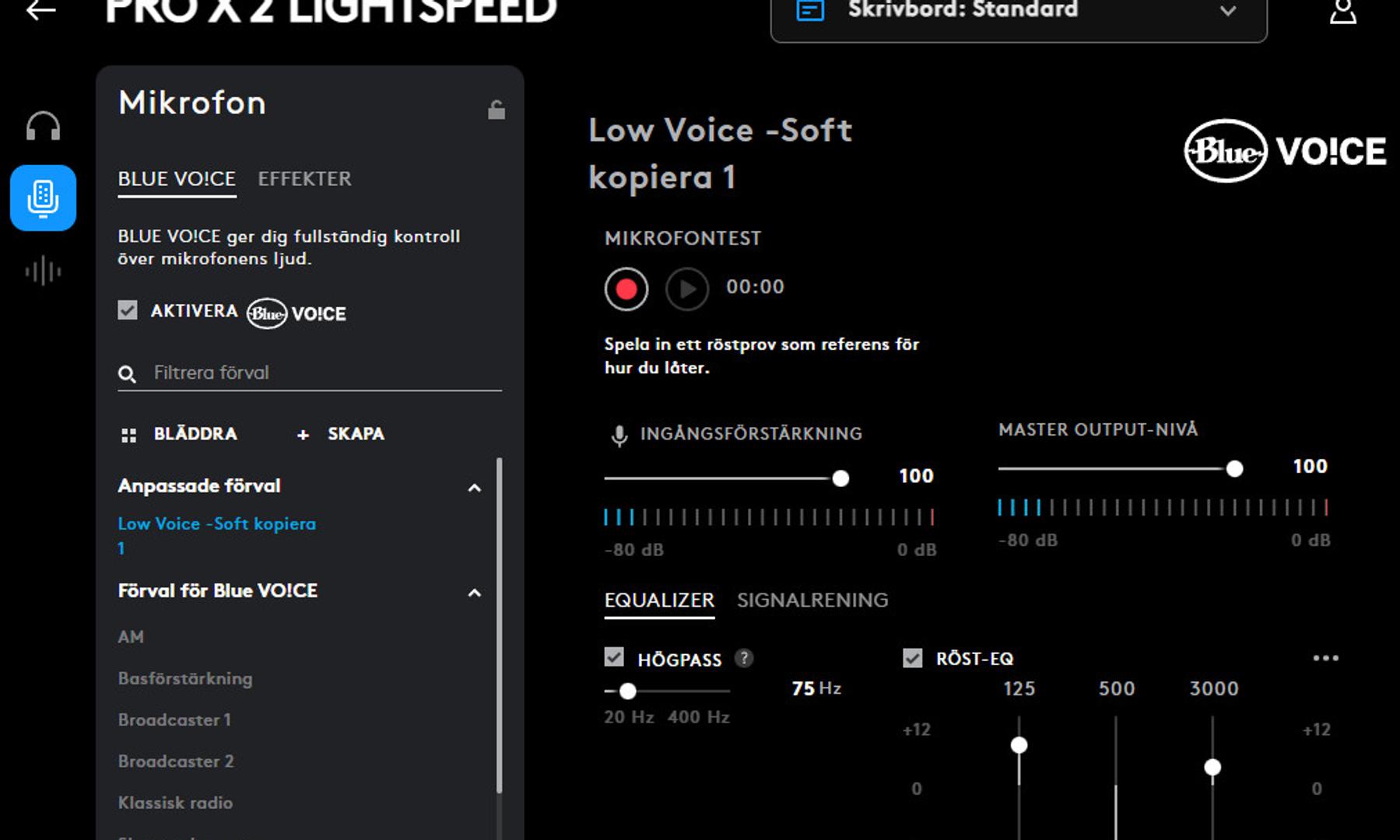 Det känns verkligen smidigt att ha samtliga produkter samlade i G Hub. Det finns goda möjligheter för anpassning av olika inställningar. Här stänger du av eller slår på brusreducering på mikrofonen och ser hur många timmar du har kvar innan du behöver ladda.