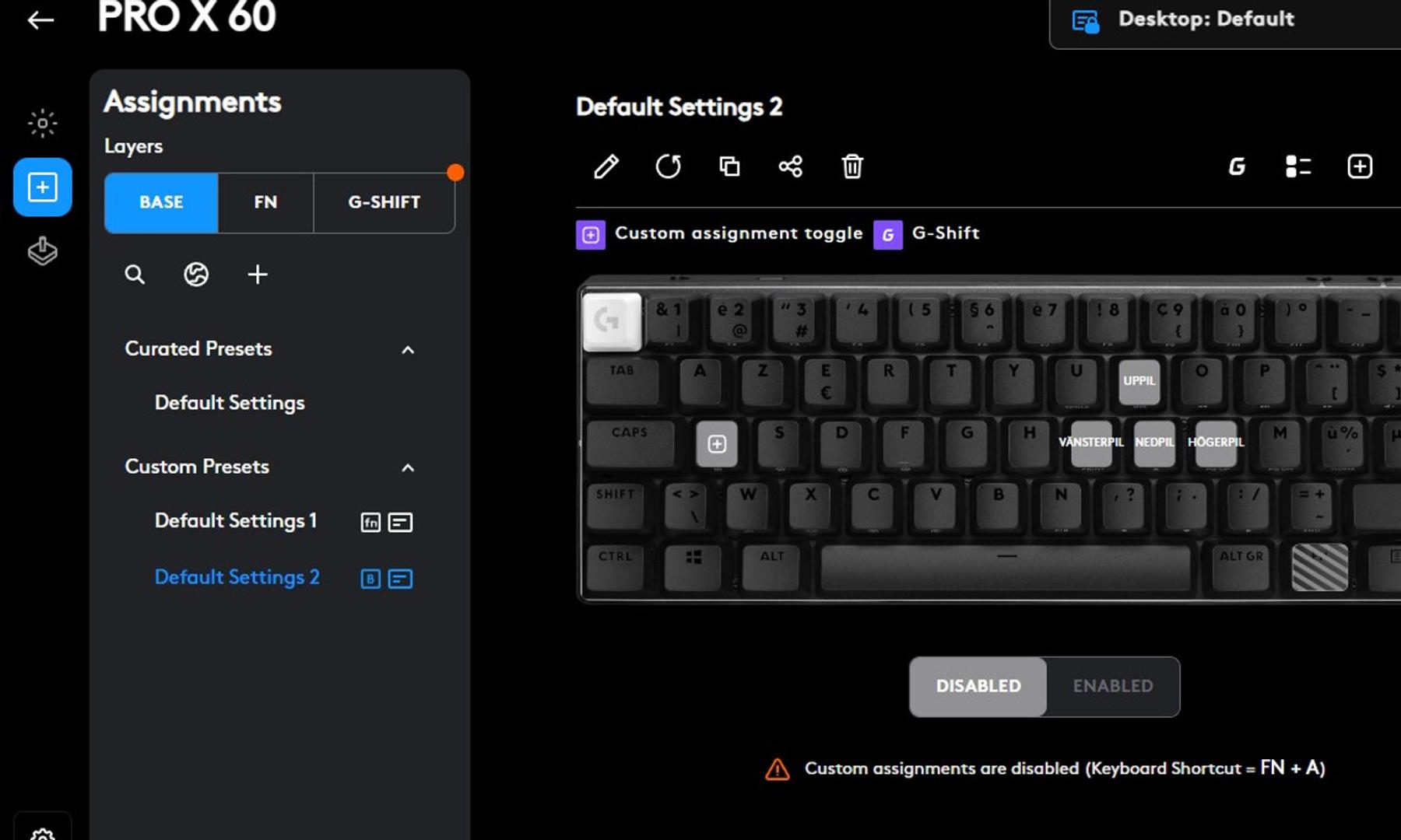 Med ett tangentbord som saknar en hel del tangenter känns det väldigt viktigt med bra mjukvara som kan stötta upp med extrafunktioner. I det här fallet olika sätt att mappa om tangenterna och att ha olika "lager" som Logitech kallar det. På första bilden över G Hub har jag ställt in så att när jag trycker på FN + A så aktiveras mina inställningar för tangenterna och då blir J = vänsterpil, I = uppil, L = högerpil och K = nedpil.