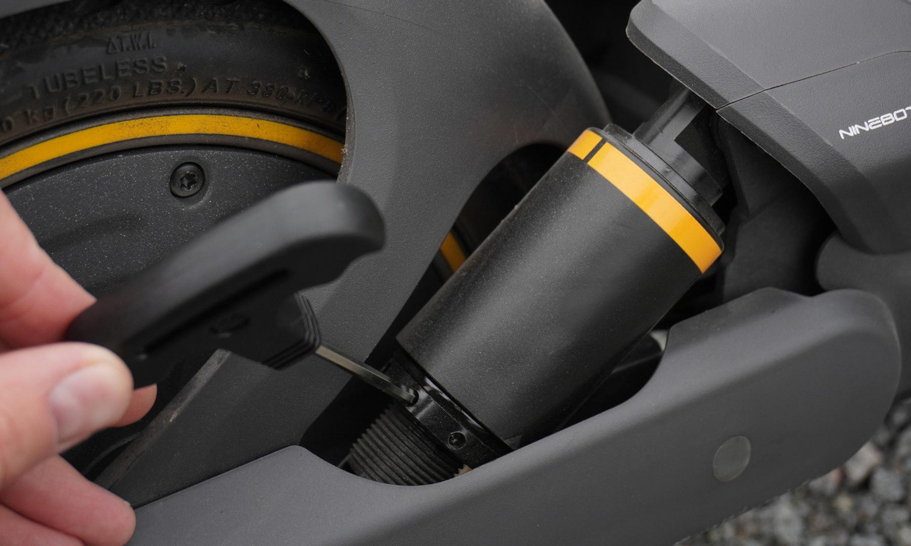 Bak sitter sedan två stycken fjäderdämpare och dessa är justerbara. Du kan dra åt dem eller lossa med medföljande verktyg. Det gör det enkelt att ställa in scootern efter behov. Hitta det läge som passar den sträcka du kör mestadels och sen är det bara att skruva om ifall du byter miljö.