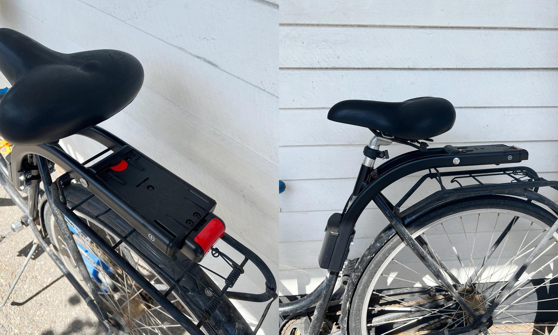 Att skifta mellan barnvagnsläge och cykelstolsläge var mycket lättare än det såg ut. Man monterar en skena på cykeln och sedan är det bara att lyfta upp stolen och glida på den på skenan. Det klickar till och då vet man att den sitter där den ska. Det går till och med att göra med barnet i (men då blir det tyngre att lyfta förstås). Med stolen väl på plats fäller man in bakhjulen så de inte sticker ut.