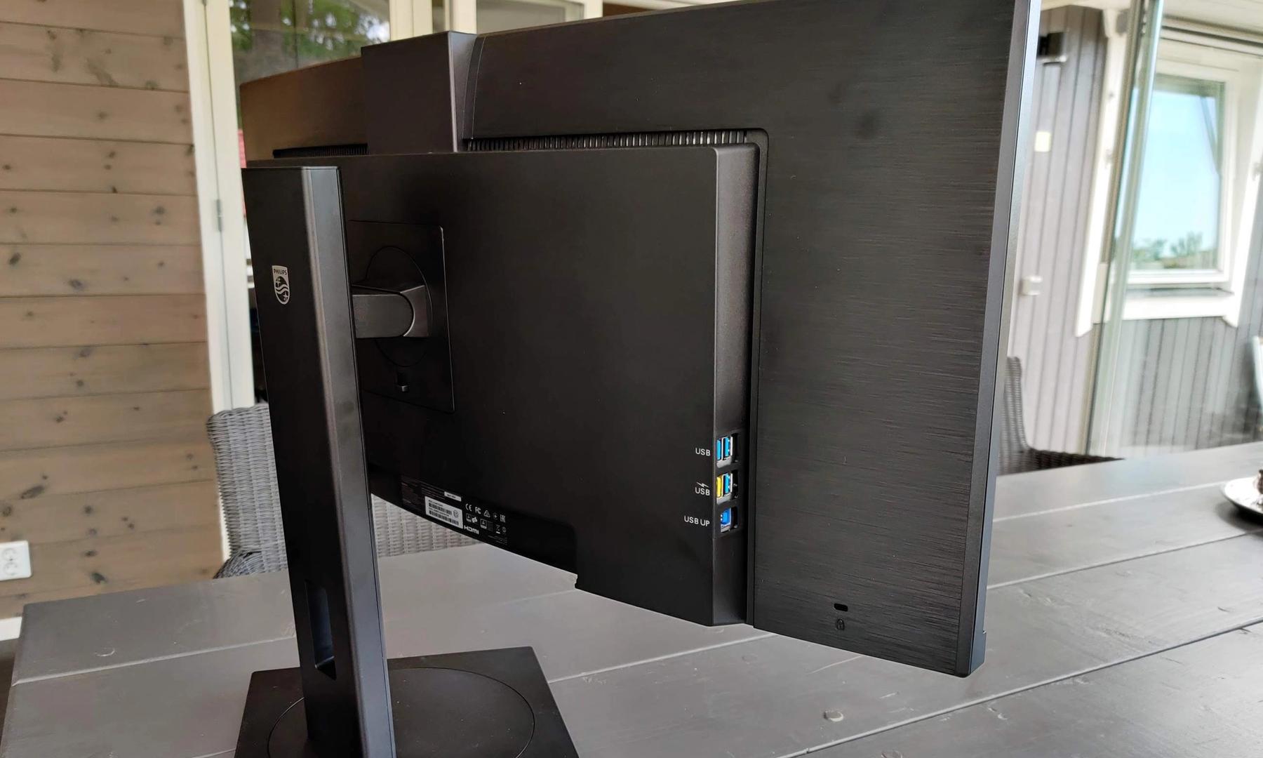 Foten och stativet tar upp rejält med plats på skrivbordet och det beror inte bara på att det är en 34”-skärm. Det är en klar nackdel eftersom du med en så stor skärm ändå vill ha lite distans. Jag sitter normalt med en 43”-skärm och den tar faktiskt upp betydligt mindre skrivbordsyta.
