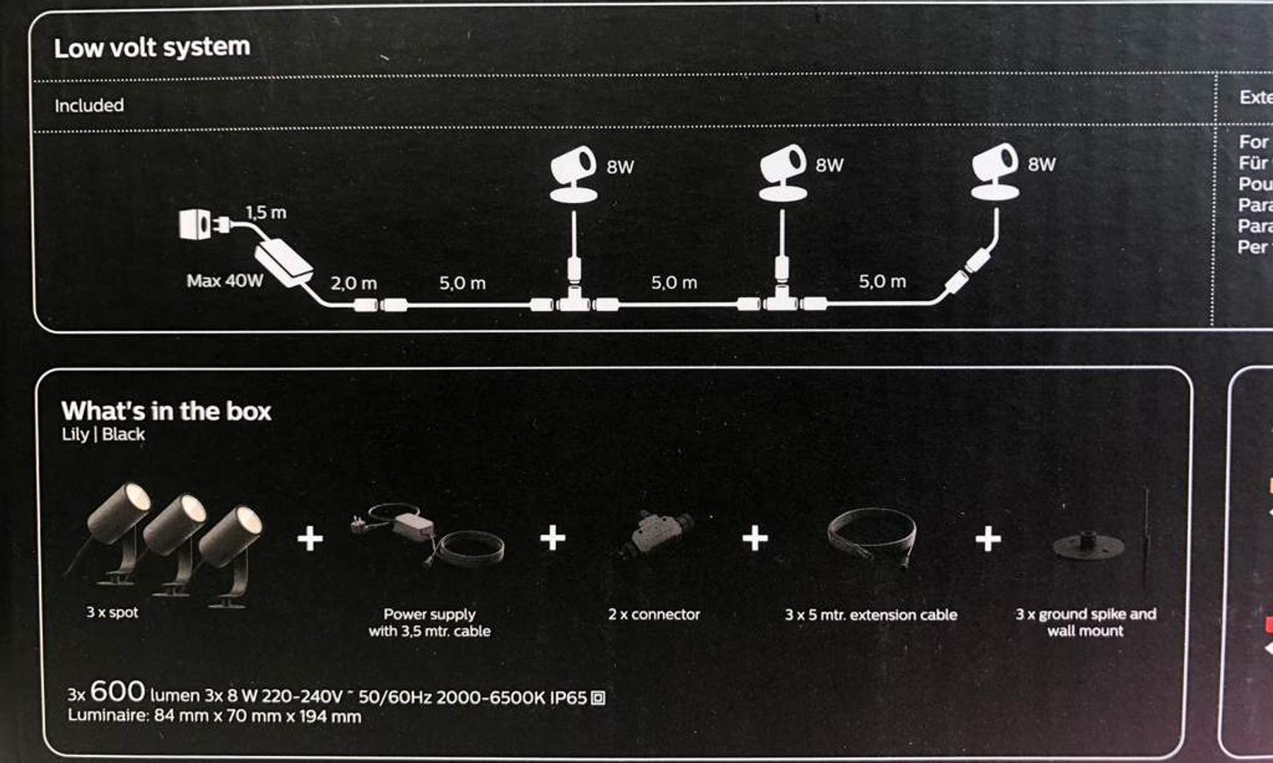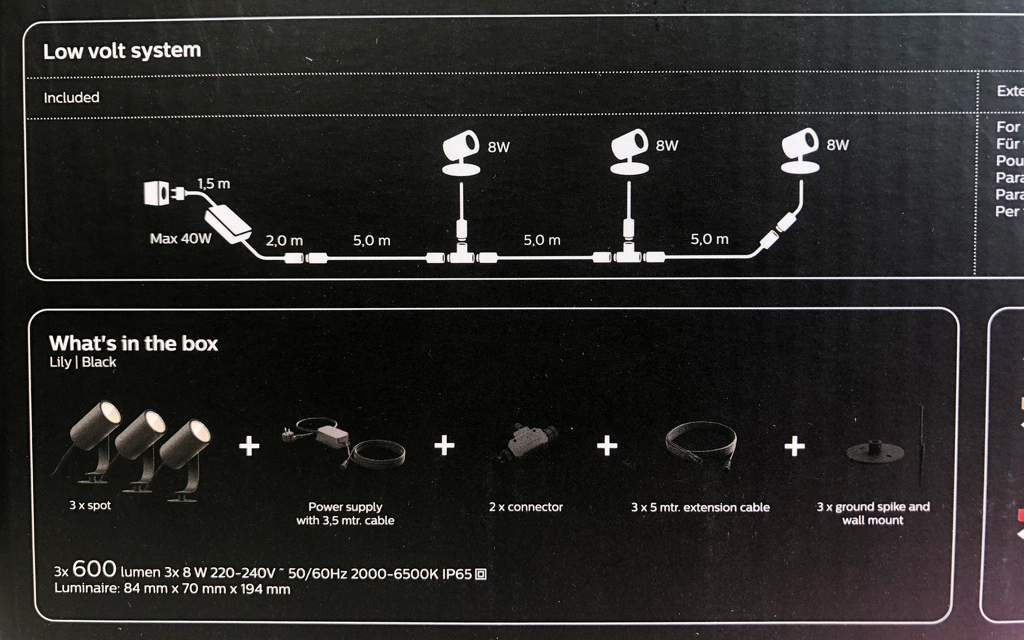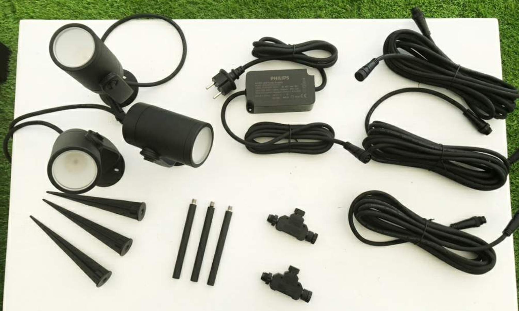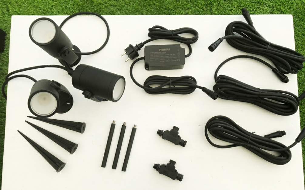 I paketet finner vi tre spotlights för utomhusbruk, en transformator och lite tillbehör. Till varje spotlight finns monteringsdetaljer så du kan sätta dem där du vill. Antingen kan du sticka ner dem i marken med jordspjut eller skruva fast dem på exempelvis fasad eller trall. Varje lampa kan roteras, vinklas och även förlängas från infästningen så det är inga problem att få dem att lysa där man vill. Vidare hittar vi tre stycken 5 meter långa kablar som seriekopplas, så du kan sprida dina nya spotlights så långt som femton meter. För att styra lamporna behöver du ha en hubb som ej medföljer i paketet.