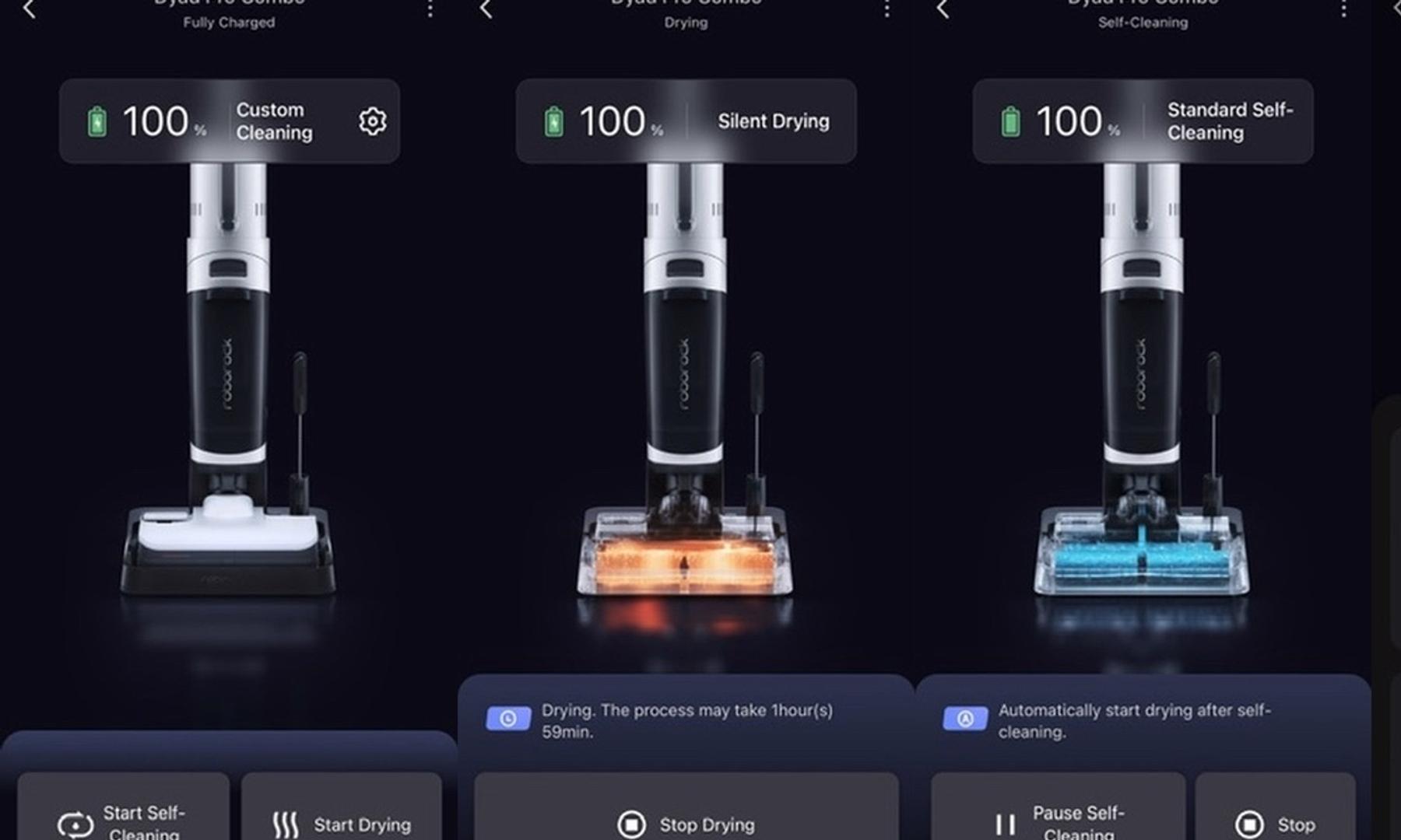När städningen är genomförd sätter man tillbaka Dyad Pro i laddstationen, som också är en rengöringsstation. Man trycker på rengöringsknappen på handtaget och självrengöringen (inklusive torkning av borstarna) startar. Du kan också sätta igång rengöringen via appen. Den låter en del en kort stund i början av programmet när den suger igenom systemet och roterar borstarna.