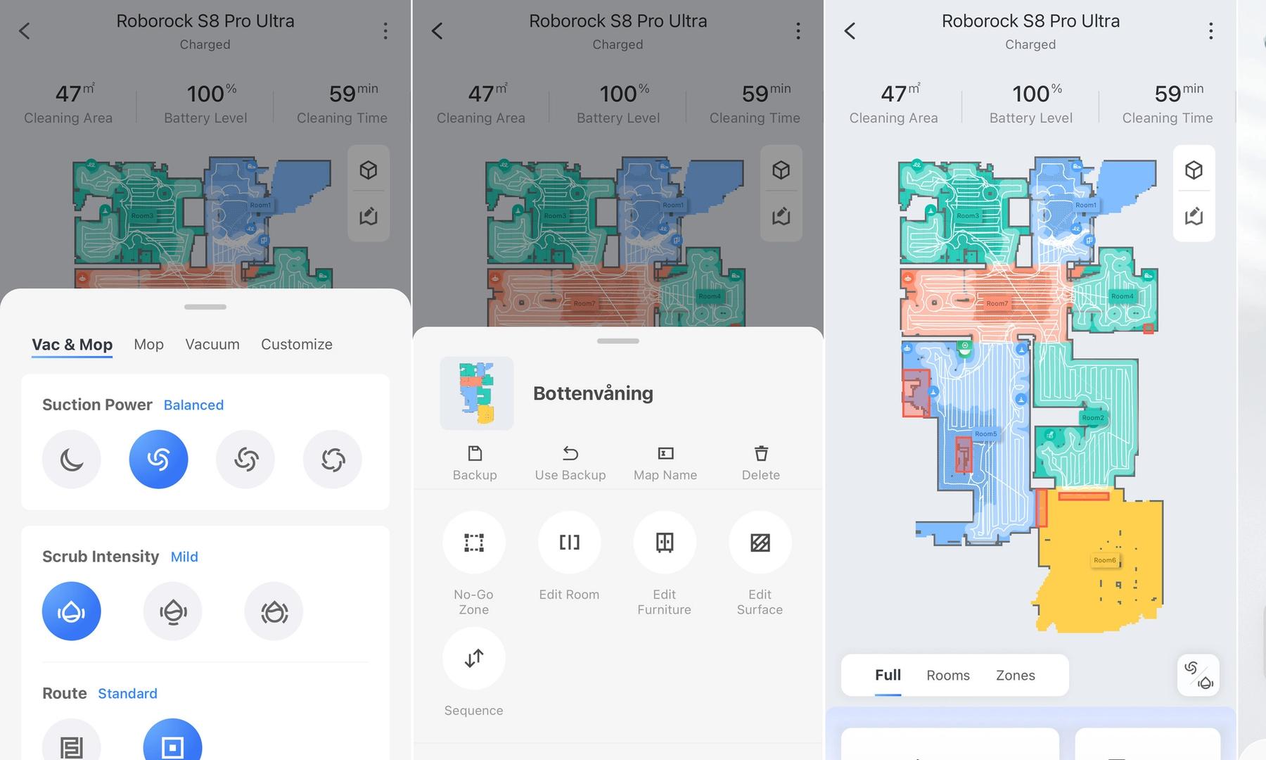 Roborocks app där man styr robotdammsugaren är välbyggd och det är enkelt att komma igång med städningen. Vid start går det att starta "fast mapping" där robotdammsugaren kör ett varv på våningsplanet och ritar upp en karta över detta på korta 4-5 minuter. Efter det kan du redigera kartan eller starta en städningen. I övrigt så finns det väldigt många möjligheter att ställa in robotdammsugaren. Allt för en effektiv städning. En funktion som jag gillade var att du kan ställa in när robotdammsugaren skall laddas, som till exempel under natten när elen kanske är billigare.