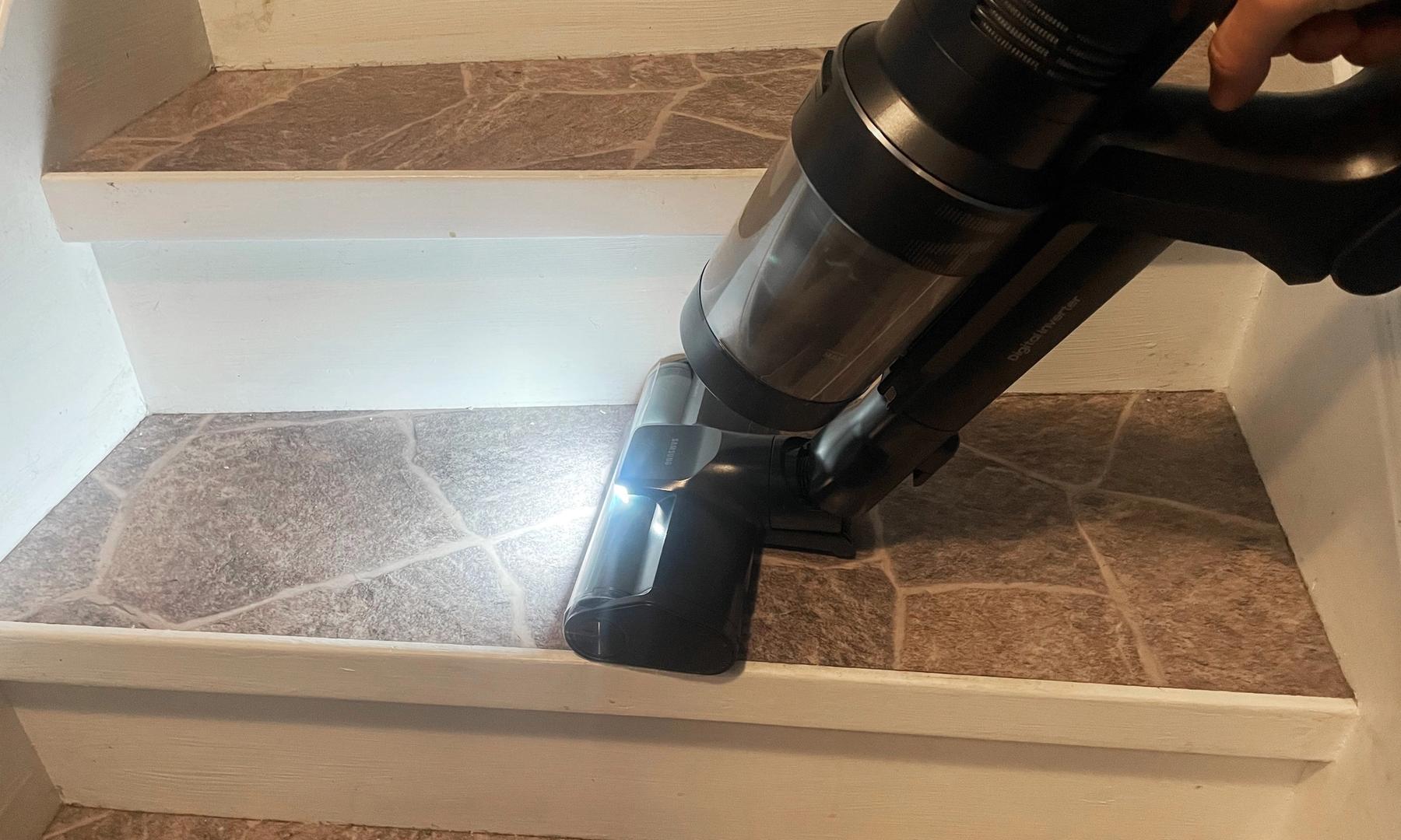 Det finns två huvudmunstycken med inbyggda lampor och sensorer för AI-funktionen. Det lite större har en en roterande borste med lite hårdare strån som passar bra för såväl vanlig dammsugning som mattor. Det lite mindre har en roterande trumma av mjukare karaktär och passade bl.a. riktigt bra för att dammsuga trappan.