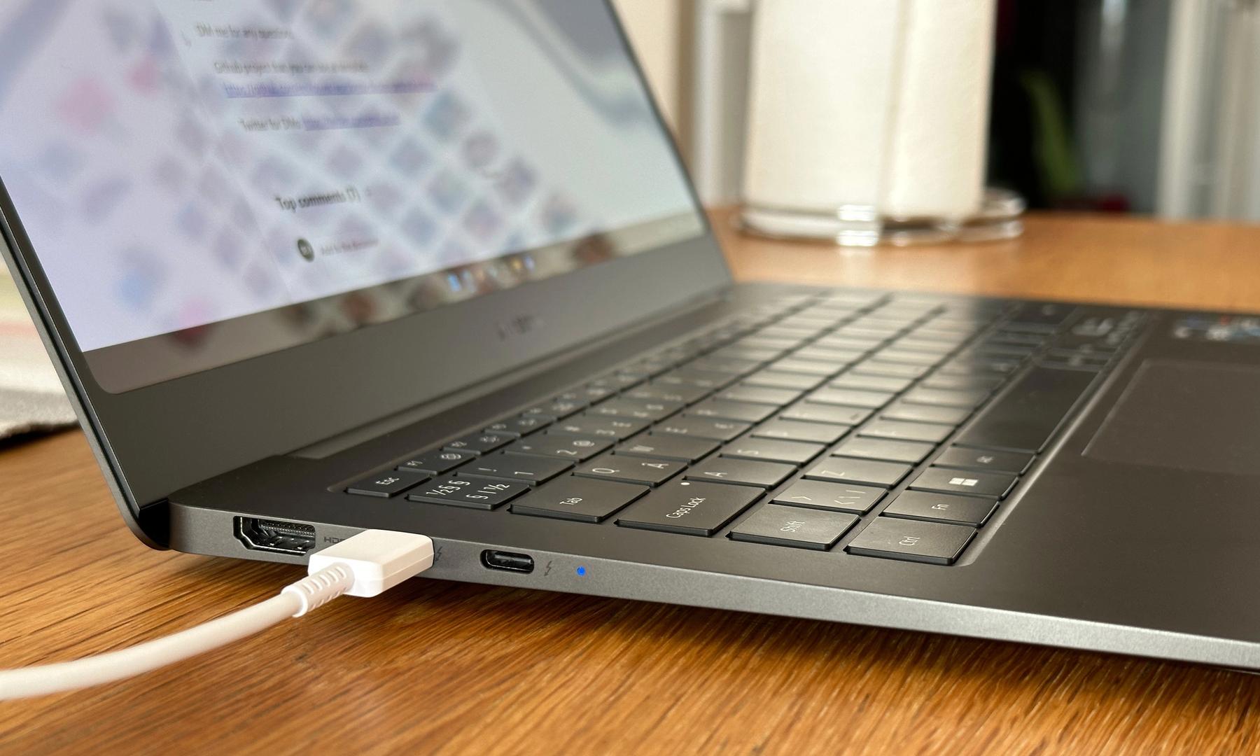Runt omkring Samsung Galaxy Book3 Pro hittar vi en rad olika portar för extern anslutning som täcker in de flesta av vardagens behov.
