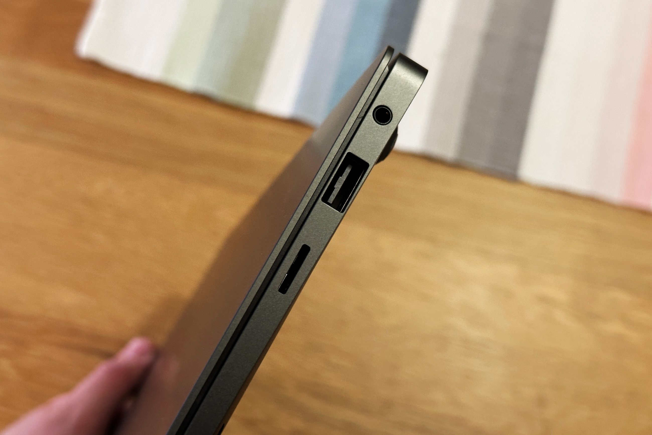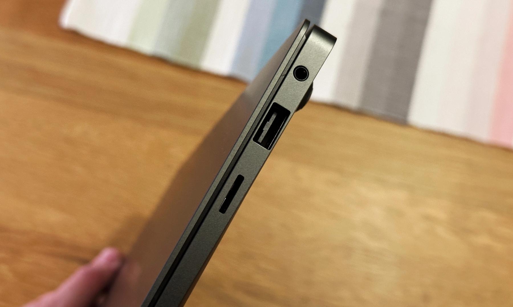 Längs med enhetens vänstra sida hittar vi dubbel uppsättning Thunderbolt 4 via USB-C, båda med stöd för laddning. Utöver detta även en HDMI-port för enkel inkoppling av extern skärm eller kanske projektor. På höger sida hittar vi istället en kombinerad 3,5 mm-utgång för ljud/mikrofon, en USB-A med stöd för USB 3.2 samt en minneskortsläsare för microSD-kort.