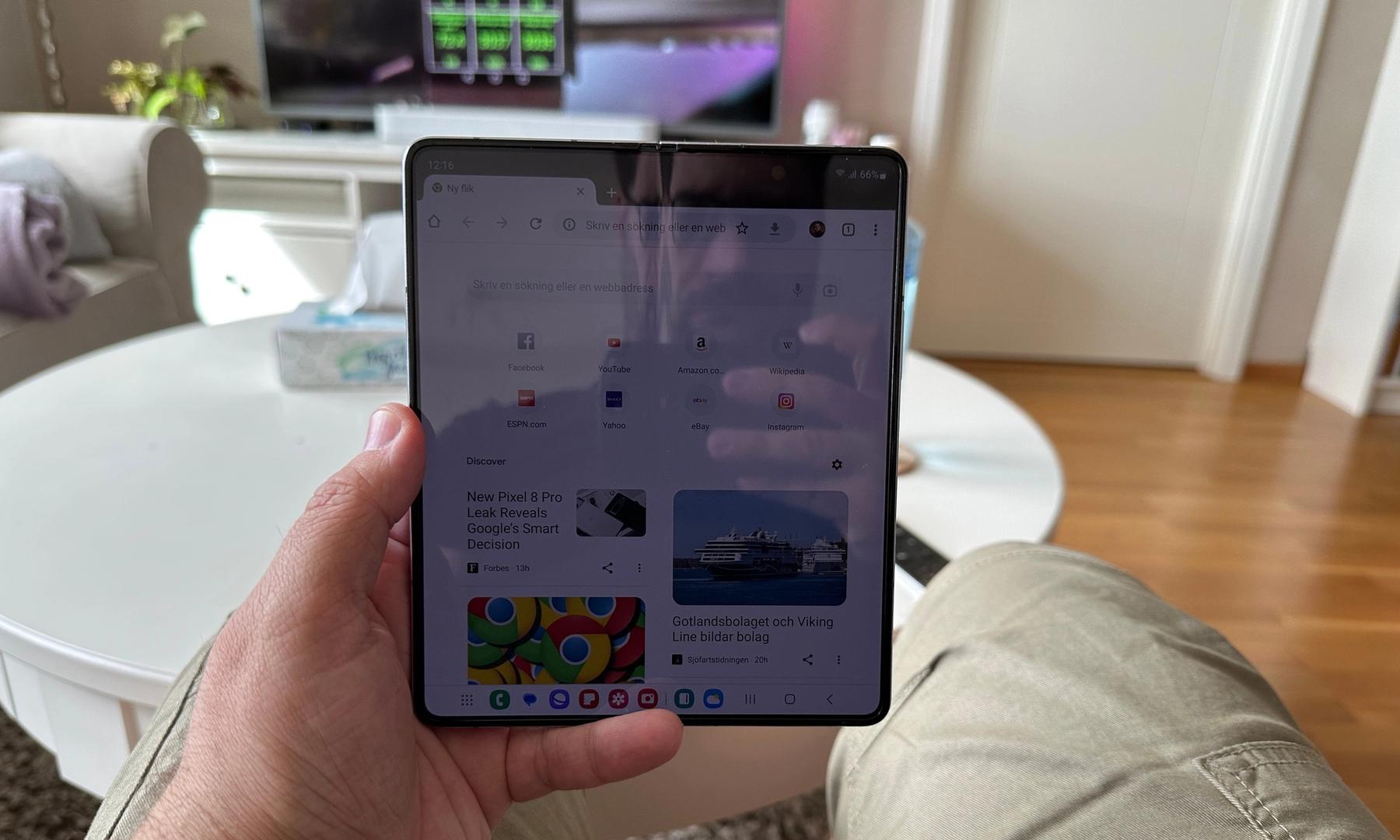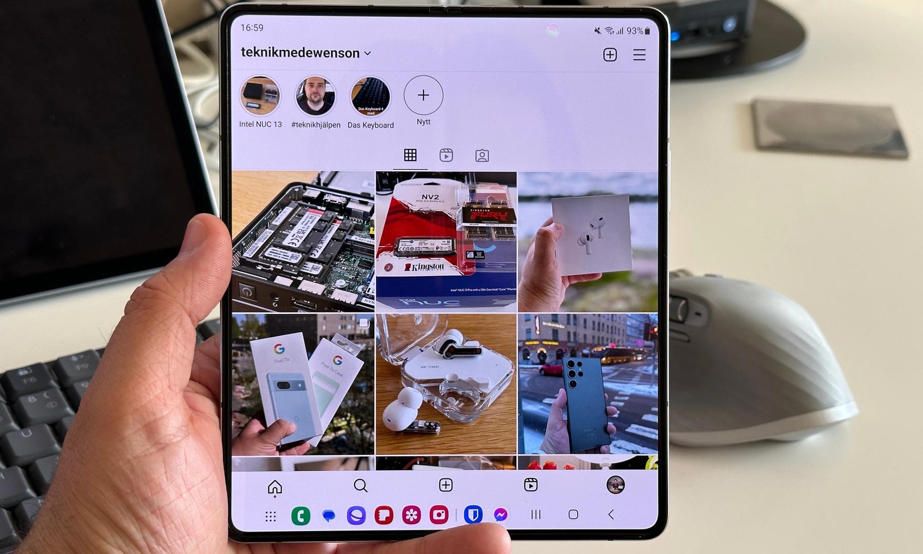 På insidan hittar vi det som särskiljer Fold 5 från en klassisk mobil, den vikbara skärmen som i sitt utvikta skick ger användaren en närmast helt kvadratisk form med extra allt.