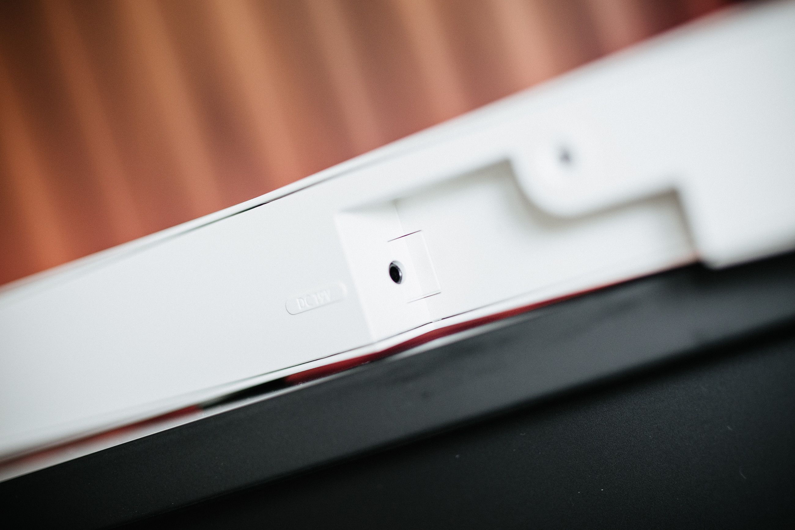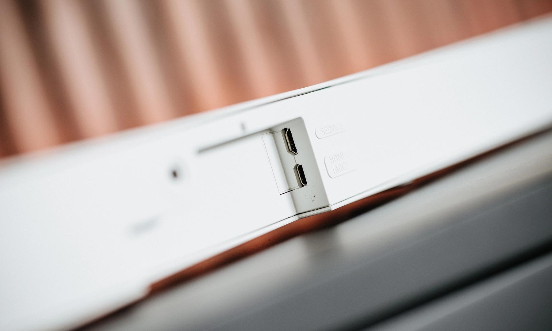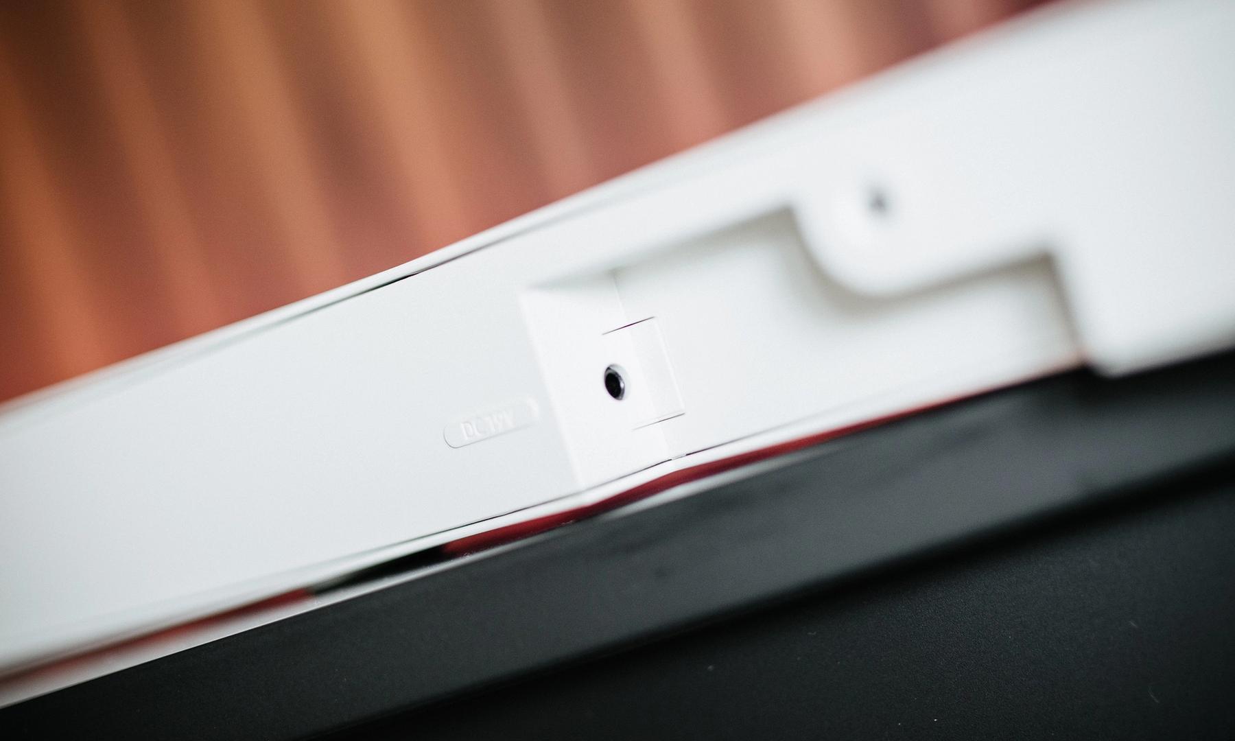 Det är med andra ord en anmärkningsvärt minimal soundbar det rör sig om. Den väger bara 1,4 kilo och profilen är så tunn att det inte ens får plats konventionella ingångar för DC och HDMI. Istället används speciella mikro-varianter av båda.