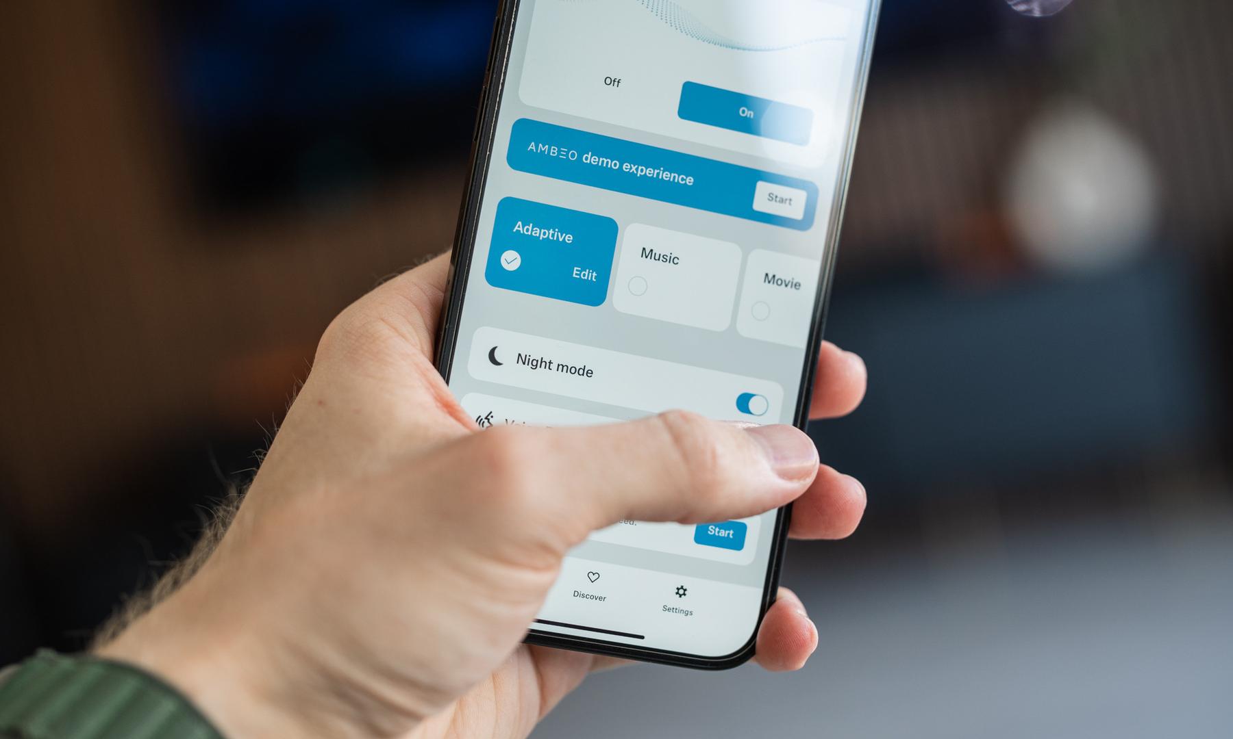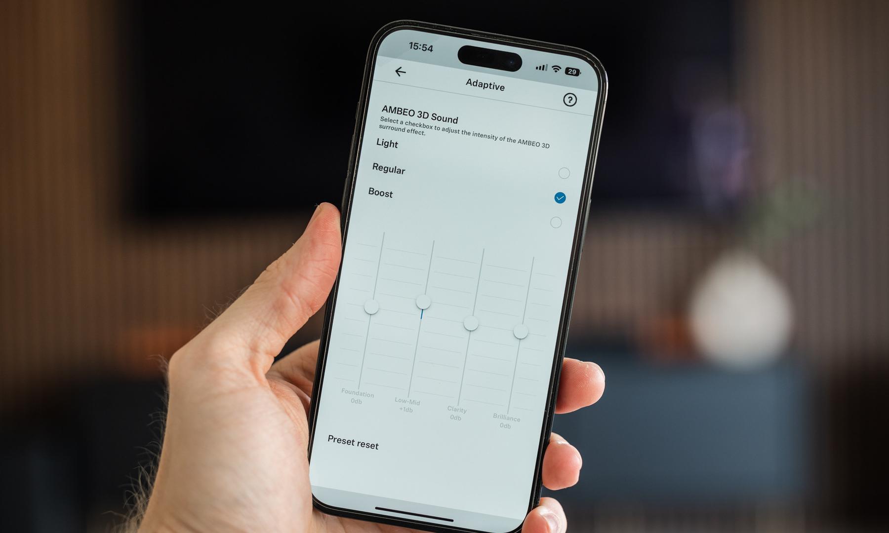 Ett antal ljudprofiler finns att tillgå beroende på innehåll som spelas, eller så kan du låta limpan välja själv med "Adaptive"-läget. Samtliga lägen är öppna för egna flerbands EQ-justeringar och du kan även välja mellan 3 olika intensitetsnivåer för AMBEO 3D-effekten.