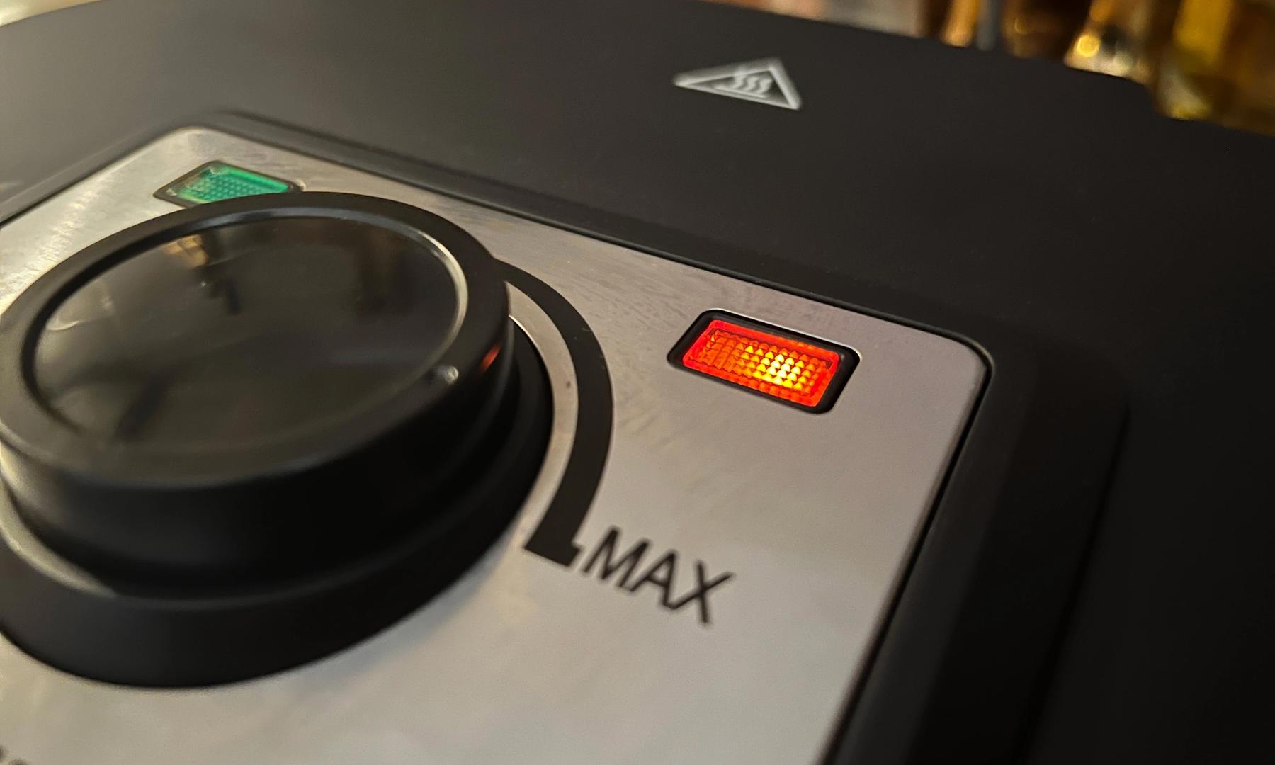 De två indikatorlamporna för "klar" och "uppvärmning" lyser i grönt respektive organge, tyvärr ganska svagt i ljust dagsljus men annars tydligt.