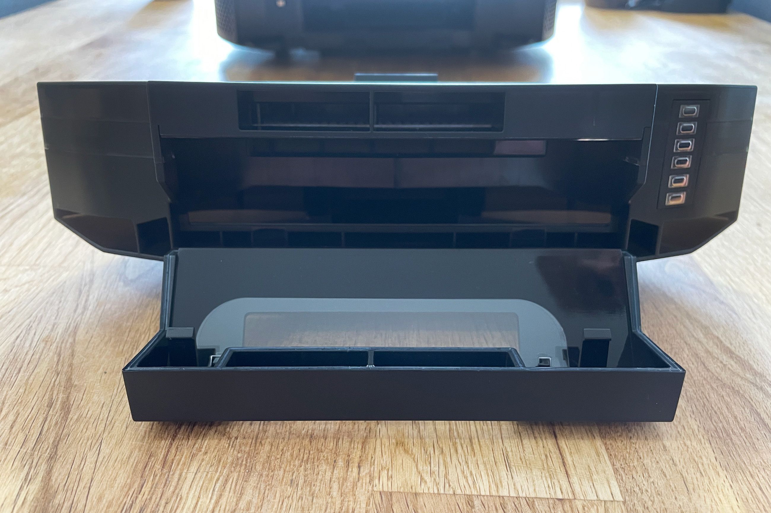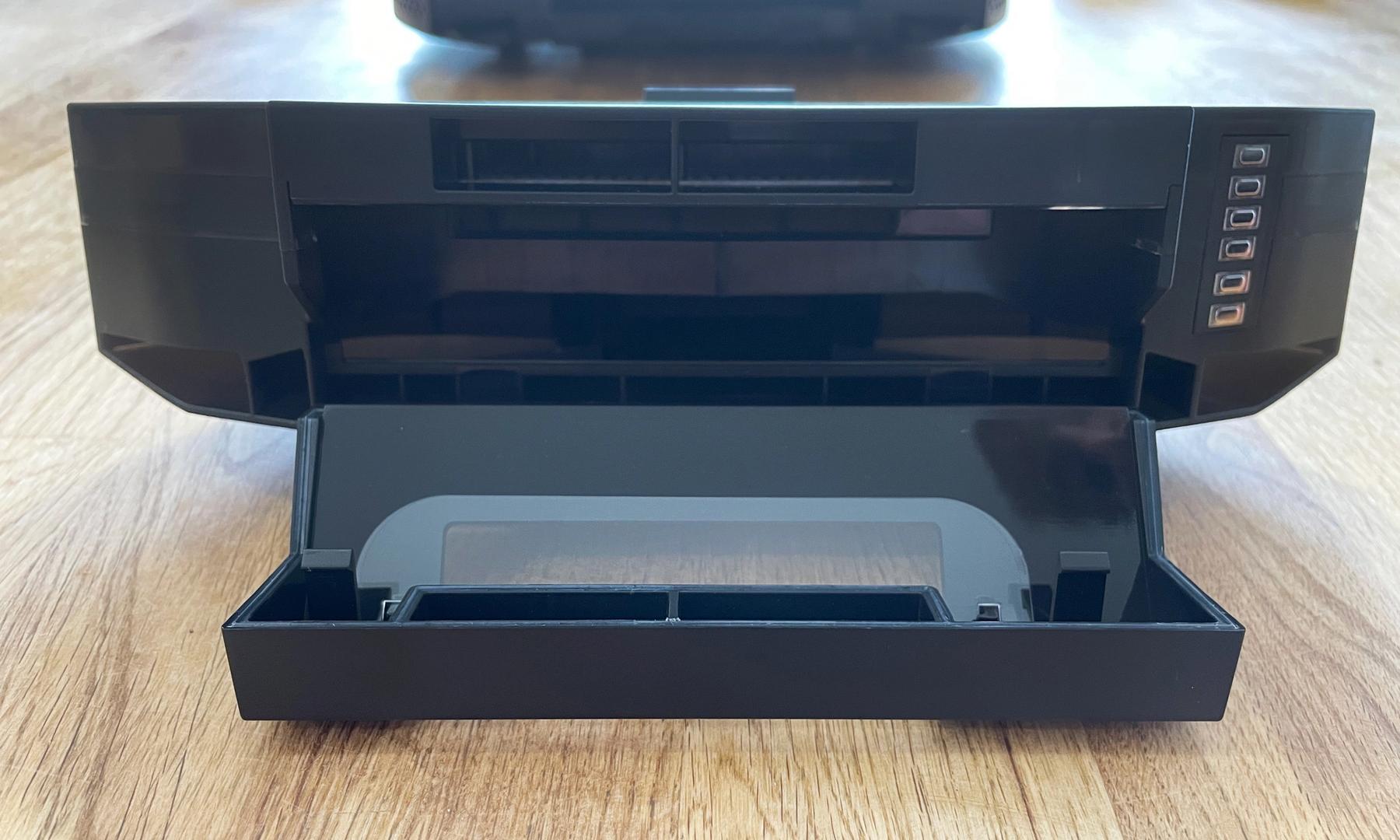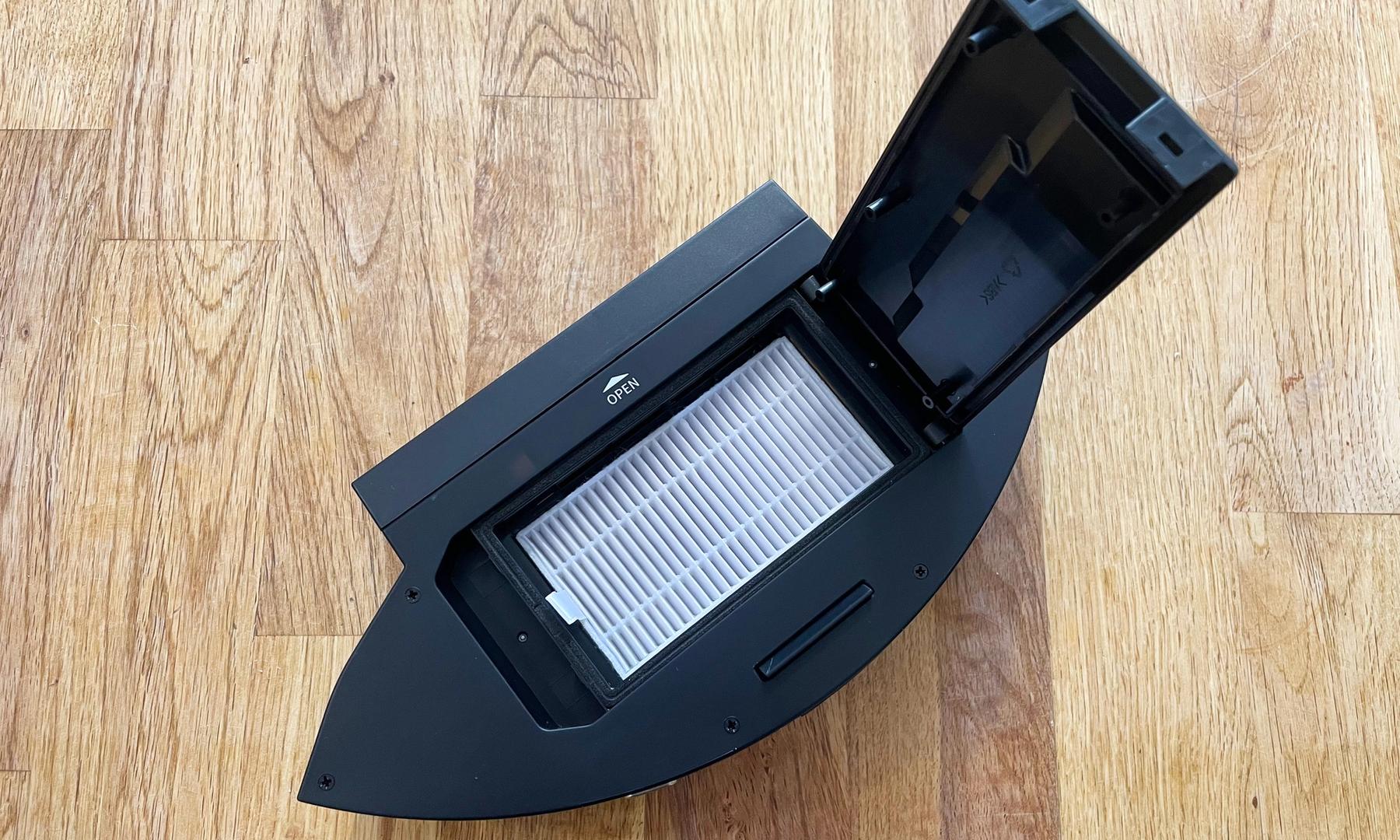 En kassett med filter och dammbehållare sitter längst bak på roboten. Den kan enkelt plockas bort med ett enhandsgrepp när dammsugaren står på laddning. Själva dammbehållaren känns lite trång och jag kan tänka mig att det kan fastna skräp om den fått i sig större pinaler, men än så länge har jag inte haft några problem vid tömning.