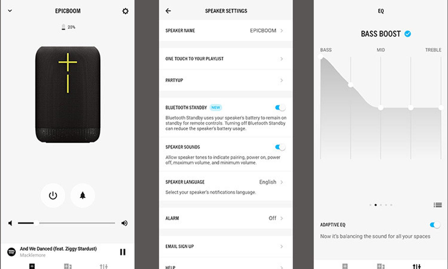 Det finns förinställda ljud om du vill ha mycket bas eller vill lyssna på en enkel podcast. Dessutom kan du göra en hel del egna ändringar, så att ljudet blir exakt som du vill att det ska låta. Om du inte vill starta högtalaren med start knappen på högtalarens ovansida så kan du göra detta direkt från mobilen, riktigt bra om man inte vill röra sig från soffan. Om du har flera Ultimate Ears-högtalare så kan du genom appen koppla ihop dem i ett party-mode så att alla spelar samma musik.