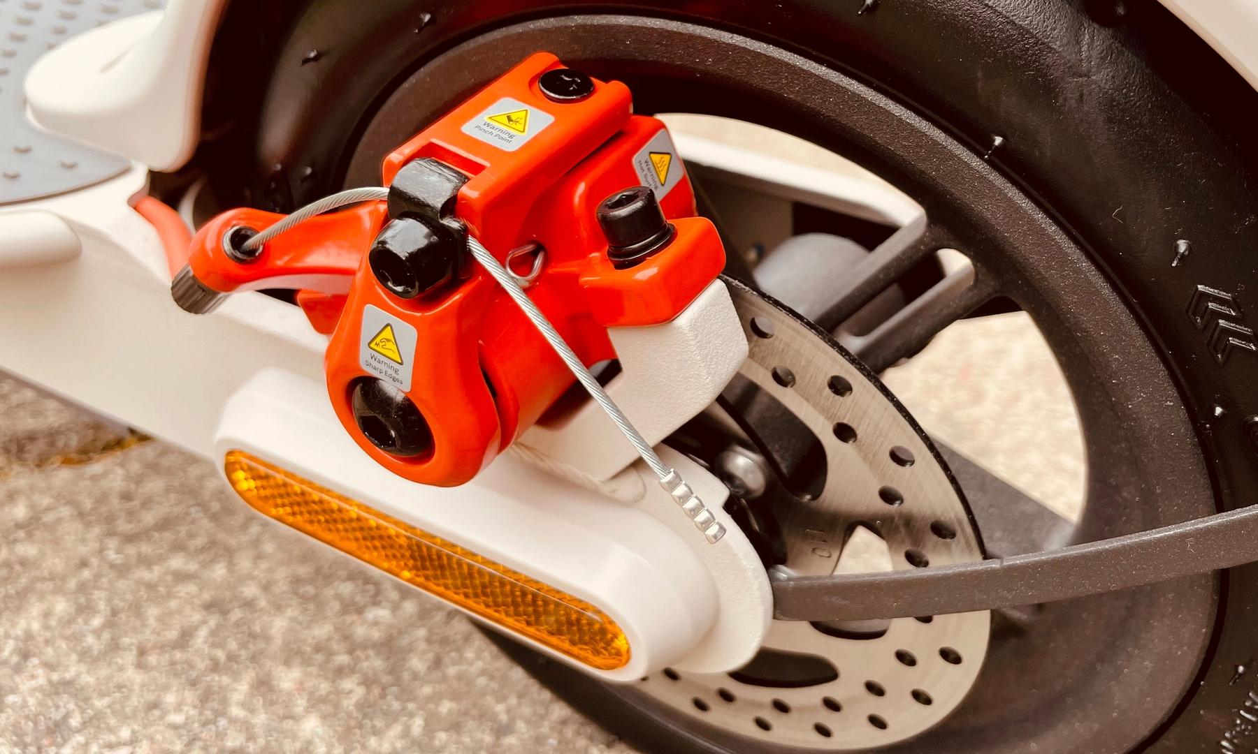 Xiaomi har med Scooter 3 uppgraderat den bakre bromsen. Den här gången sitter det klossar på båda sidorna av bromsskivan, och det märks verkligen! Handbromsen känns stabilare då bromsen nyper till direkt och jag känner mig väldigt trygg när jag kör. Det främre däcket (där motorn sitter) stryps fortfarande elektroniskt samtidigt, precis på föregående modeller.