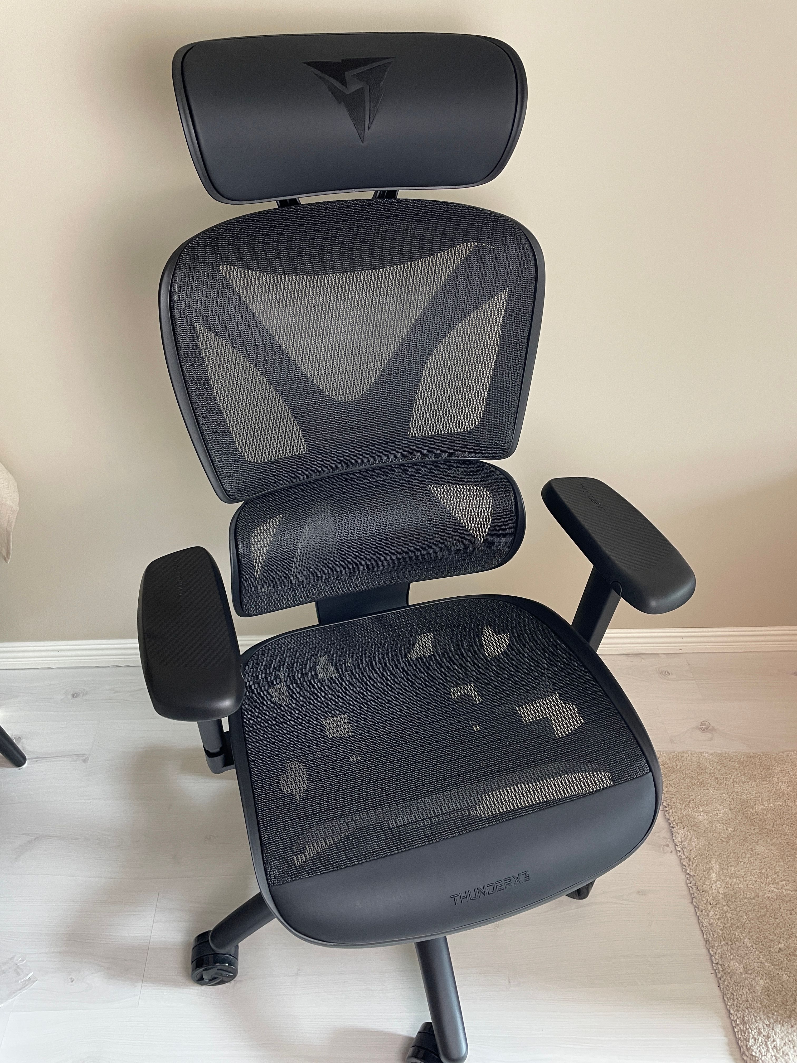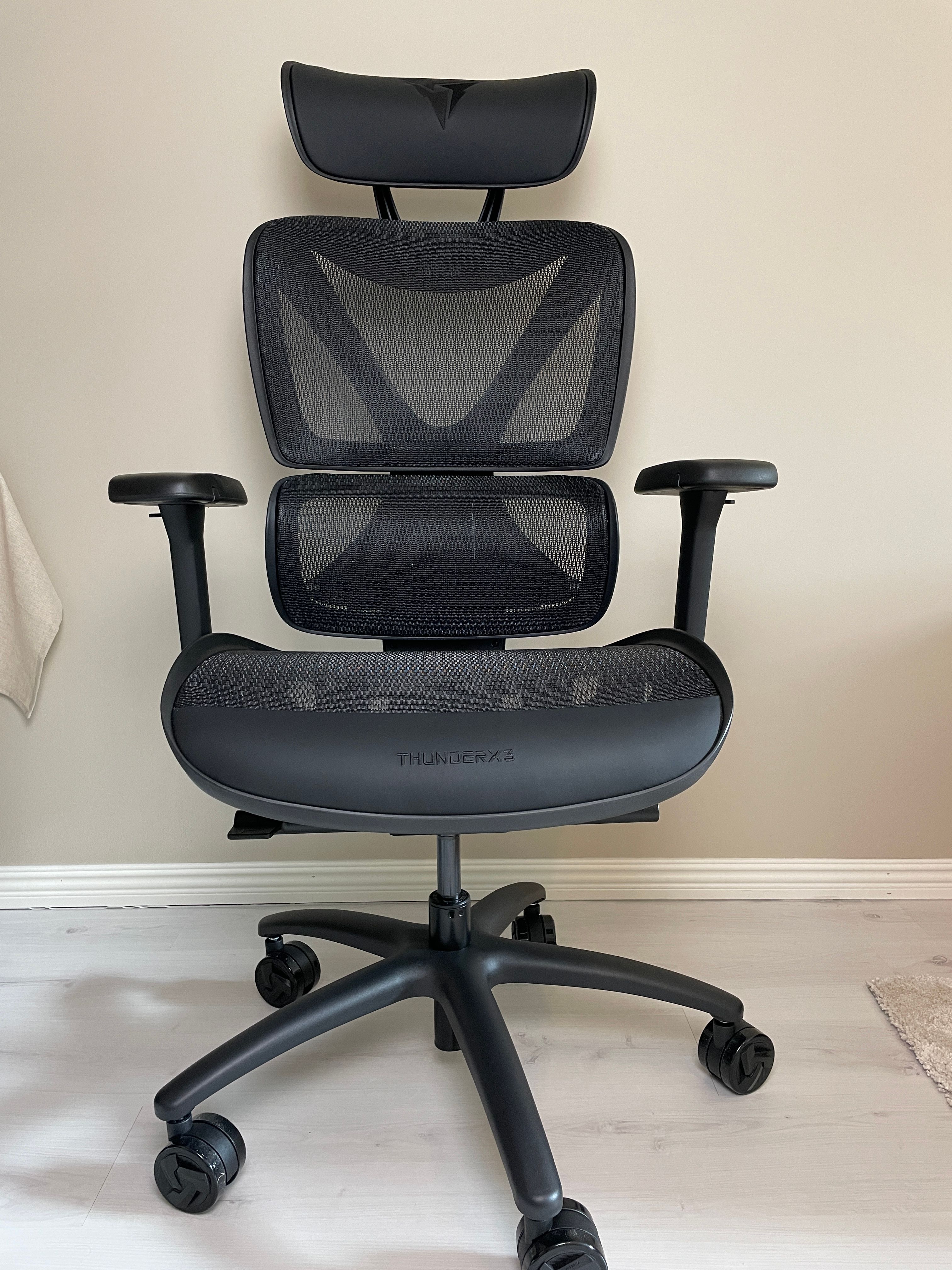 Efter att stolen har monterats var min första känsla att Thunder X3 XTC är en meshstol som ger mycket för pengarna. Den har svankstöd och justerbart nackstöd i skönt material. Hjulen rullar bra och skadar inte golvet. Både sitsen och ryggstödet är gjorda av mesh-material. Armstöden känns gedigna men kan inte skjutas mer inåt mot kroppen, ändå rejäla.
