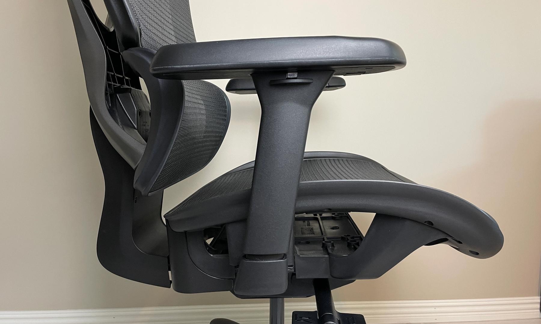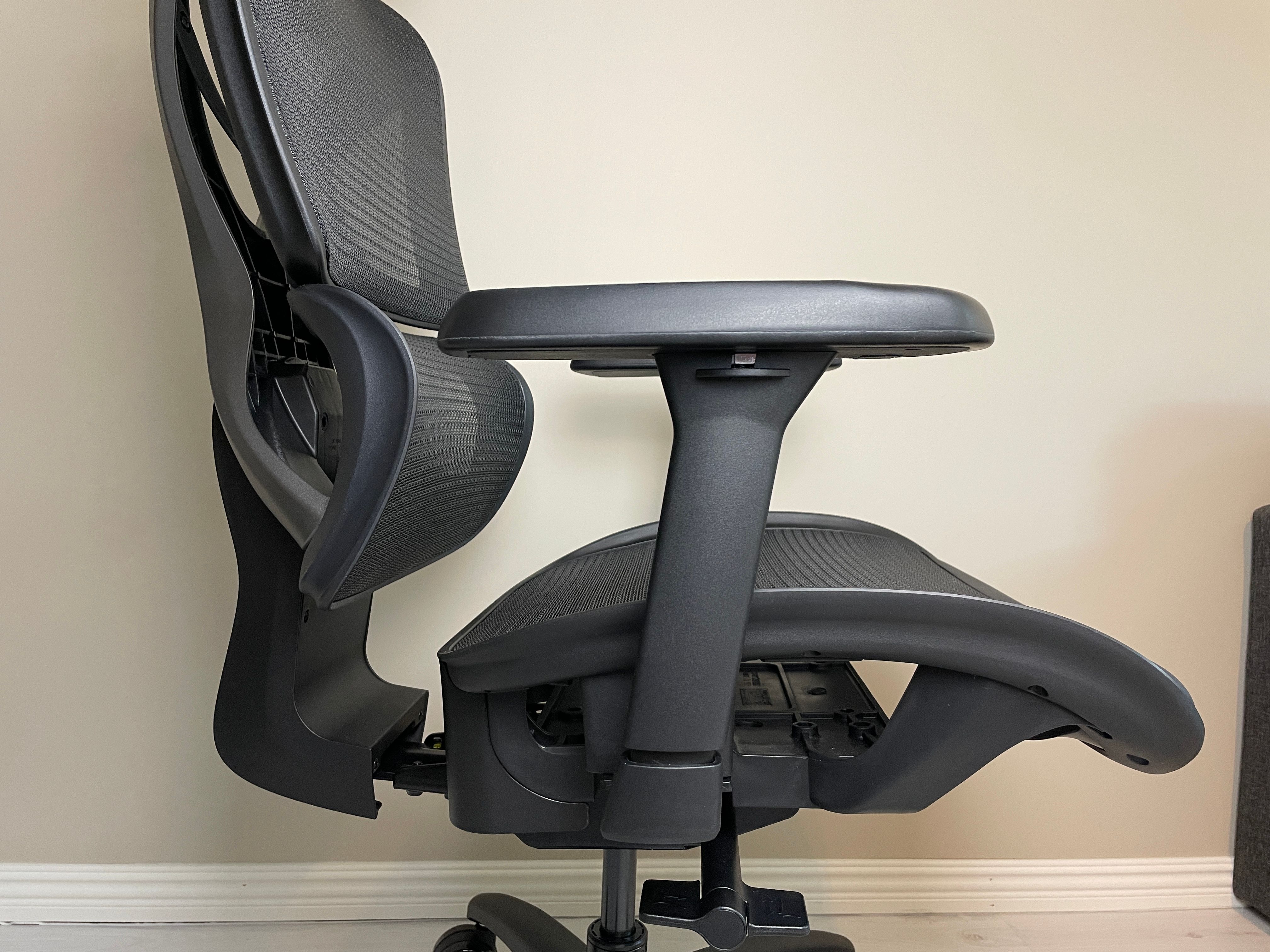 Till höger finns en spak med två reglage; det ena höjer och sänker stolen, och det andra möjliggör att dra ut sitsen vilket ger en bättre sittposition för dem med långa ben. Om detta ställs in rätt så sitter man bättre för knänas skull i stolen. Jag föredrog att ha sitsen fullt indragen då det gav mig bästa sittpositionen.
