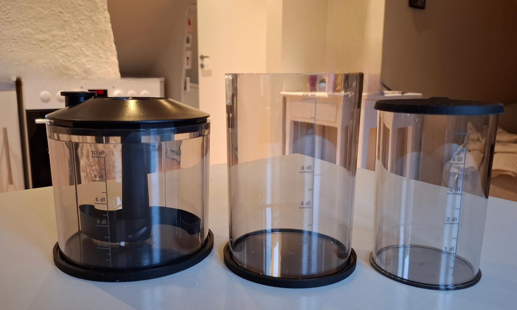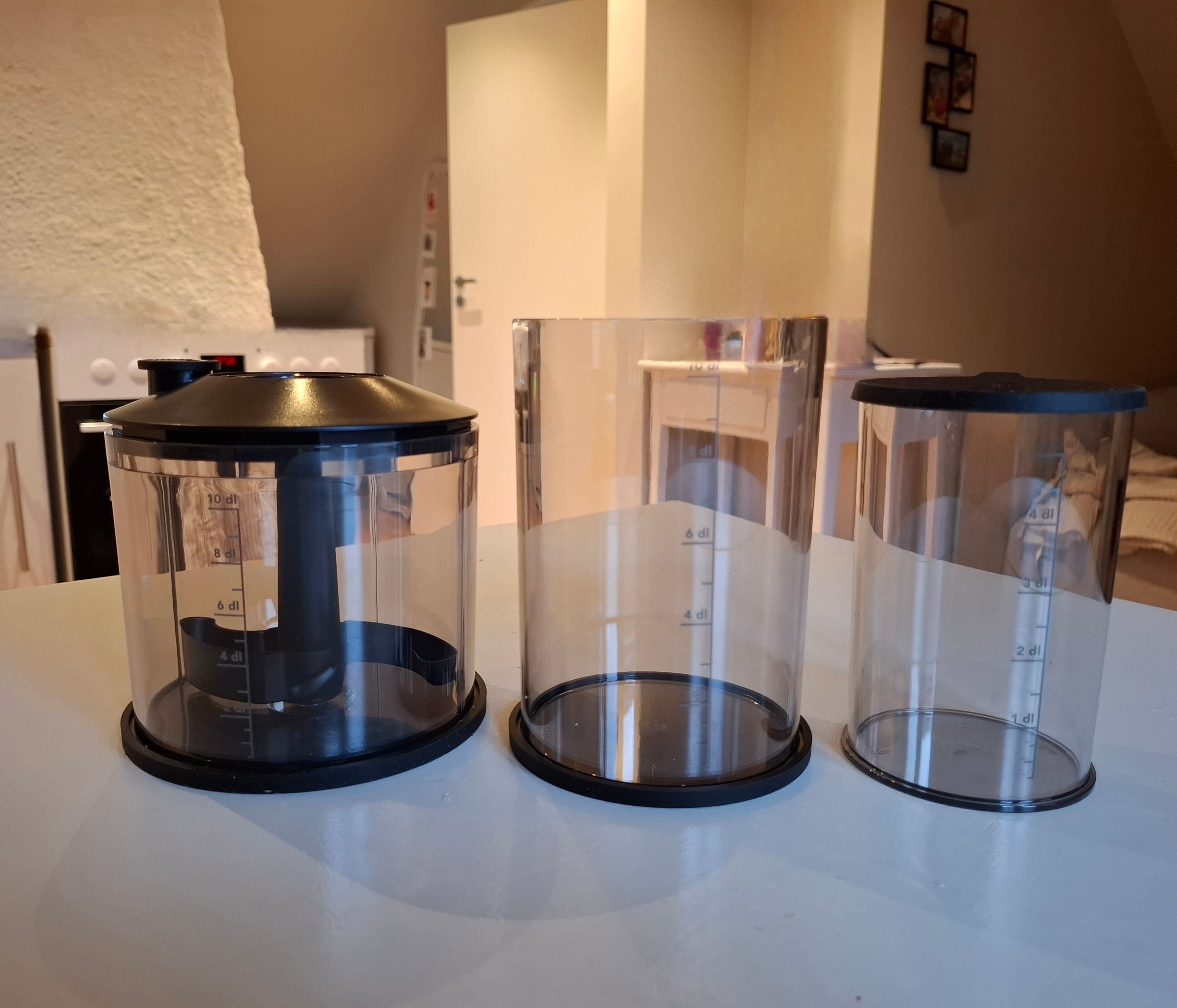 När det gäller tillbehör så följer det med ett ganska bra urval extradelar, bland annat två mixerstavar i olika storlekar, en hackbägare med knivblad, en dubbelvisp samt ett litet och ett stort måttbägare. Dessutom ingår silikonlock till både hackbägaren och måttbägarna.