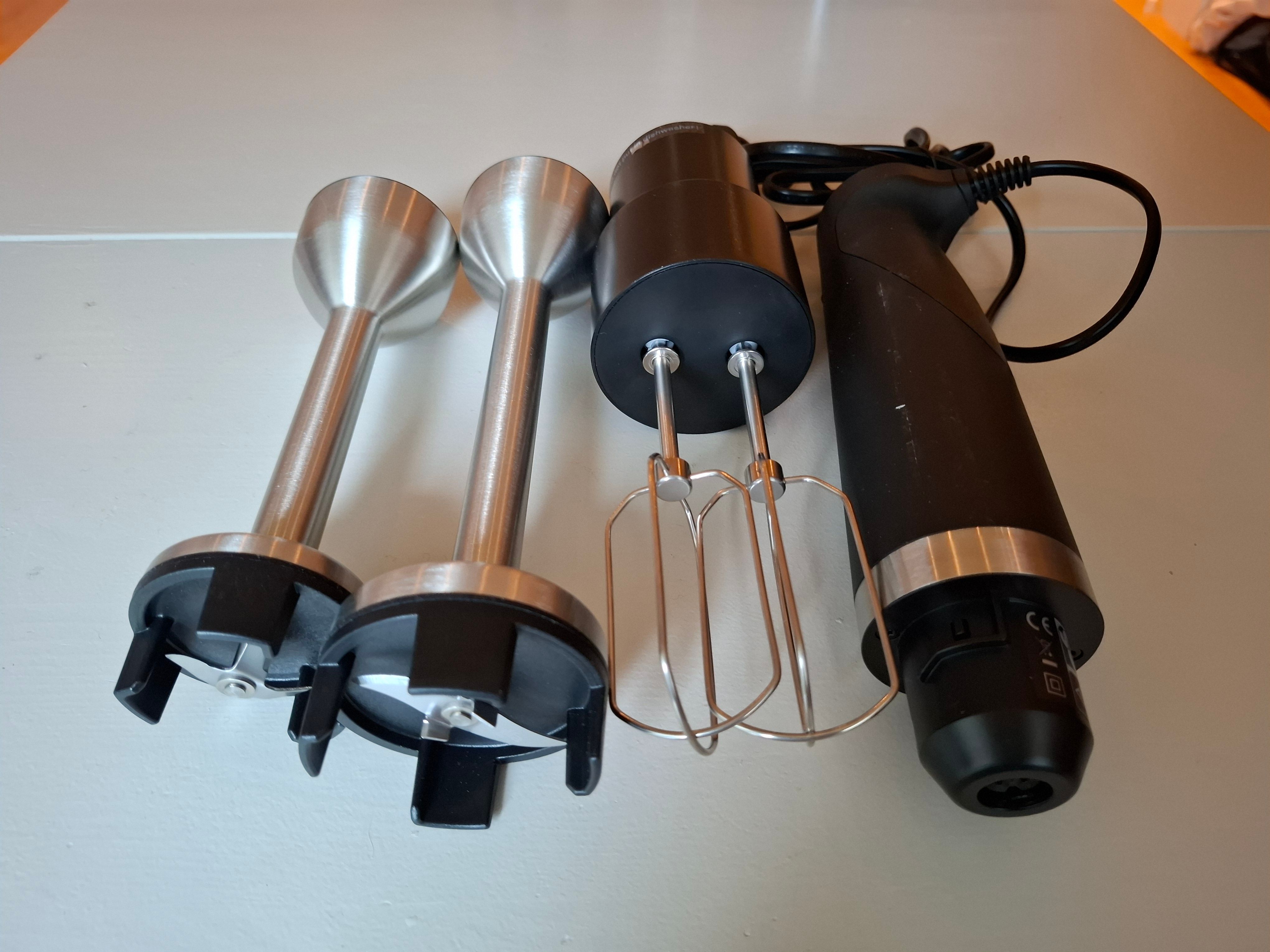 Tillbehören känns ganska robusta och solida, särskilt mixerstavarna som är i stål. Den allra nedersta delen på båda stavarna är gjord i plast för att förhindra att de repar till exempel kastruller. Även om det är mer skonsamt mot kastrullerna gör plasten att stavmixern känns lite billigare, och jag hade föredragit att hela staven var i stål. Det är däremot inget stort problem.
