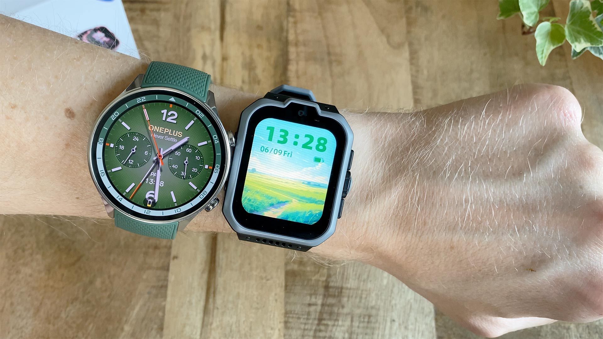 Nu är klockan visserligen mer av det rektangulära formatet men håller ändå någorlunda samma storlek som den riktigt bastanta OnePlus Watch 2R. Som i sin tur har en boettstorlek på 46 mm. Ganska stort för mig och riktigt stort för en femåring. Men det är ungefär samma visa med andra smartklockor för barn.