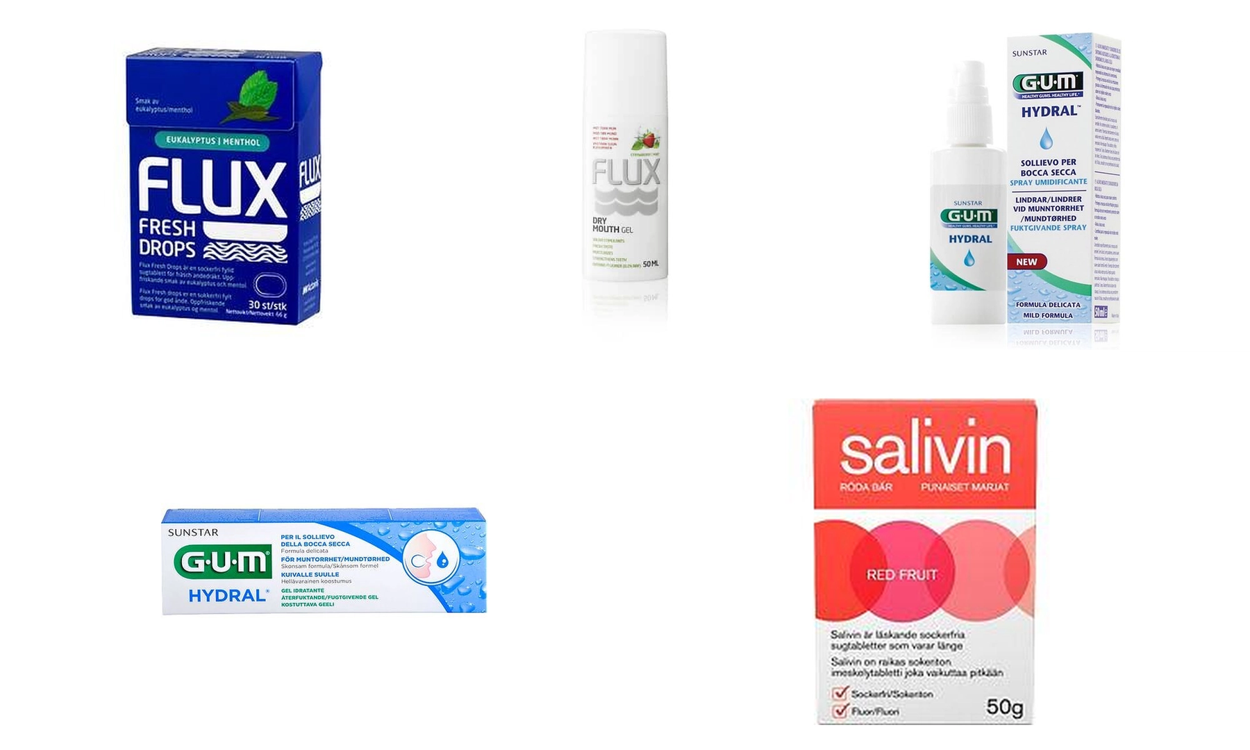 Om du har salivsekretion men den är minskad kan du ta salivstimulerande produkter. Har du ingen salivproduktion alls kan geler och spray hjälpa dig att hålla slemhinnorna återfuktade. I listan nedan finns produkter för båda besvären.