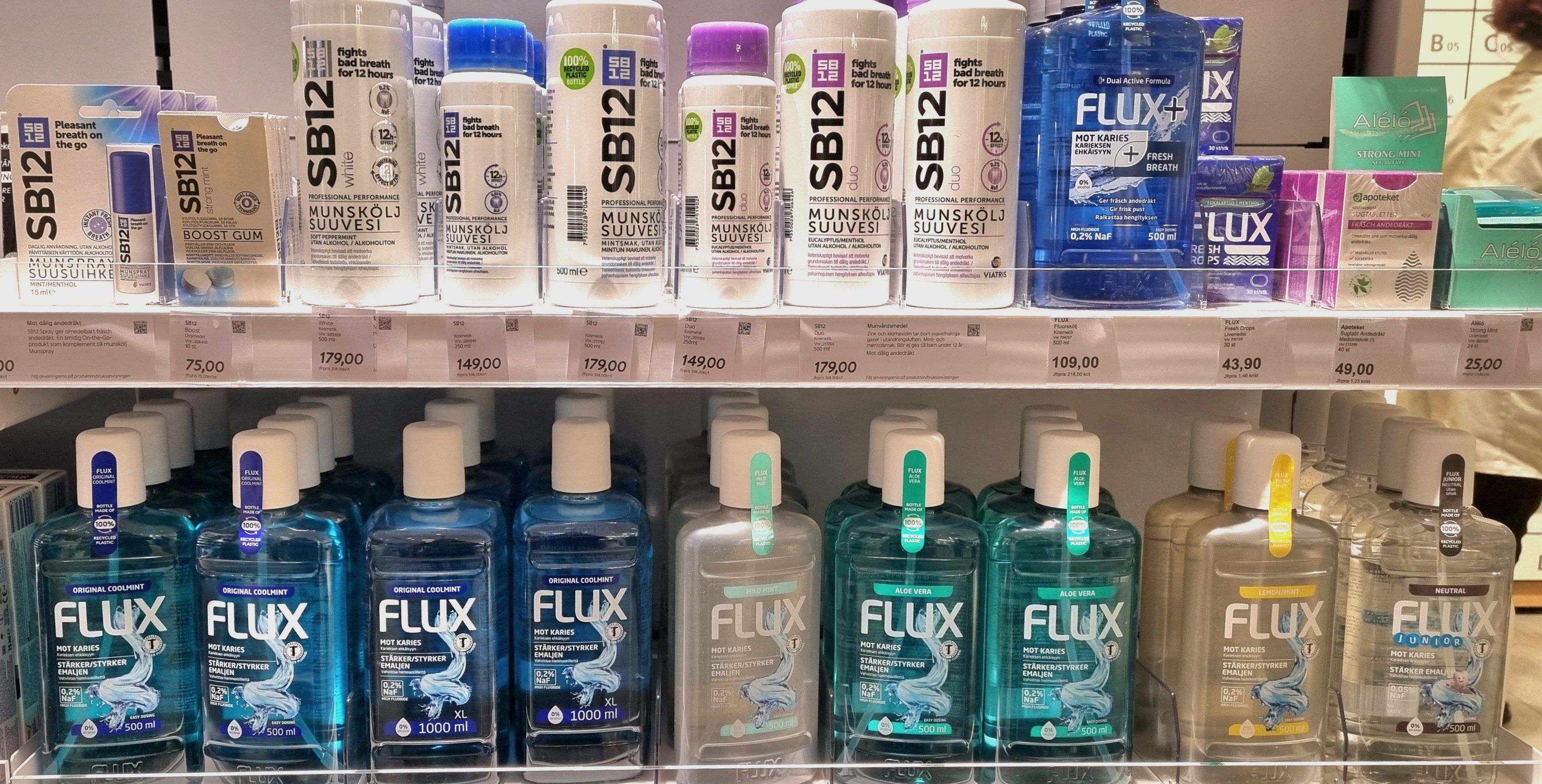 Det man ska kolla efter när du handlar en fluorskölj är att den ska innehålla 0,2% natriumfluorid (NaF). Är det lägre procent än skulle jag säga att det knappt är lönt.