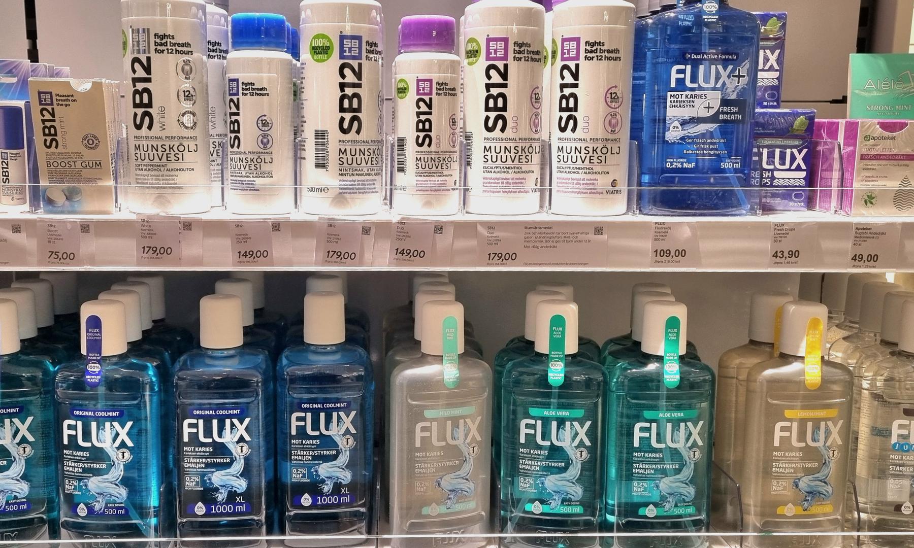 Flux munskölj finns i olika smaker, bl.a. lemon, aloe vera, cool mint och mild mint.