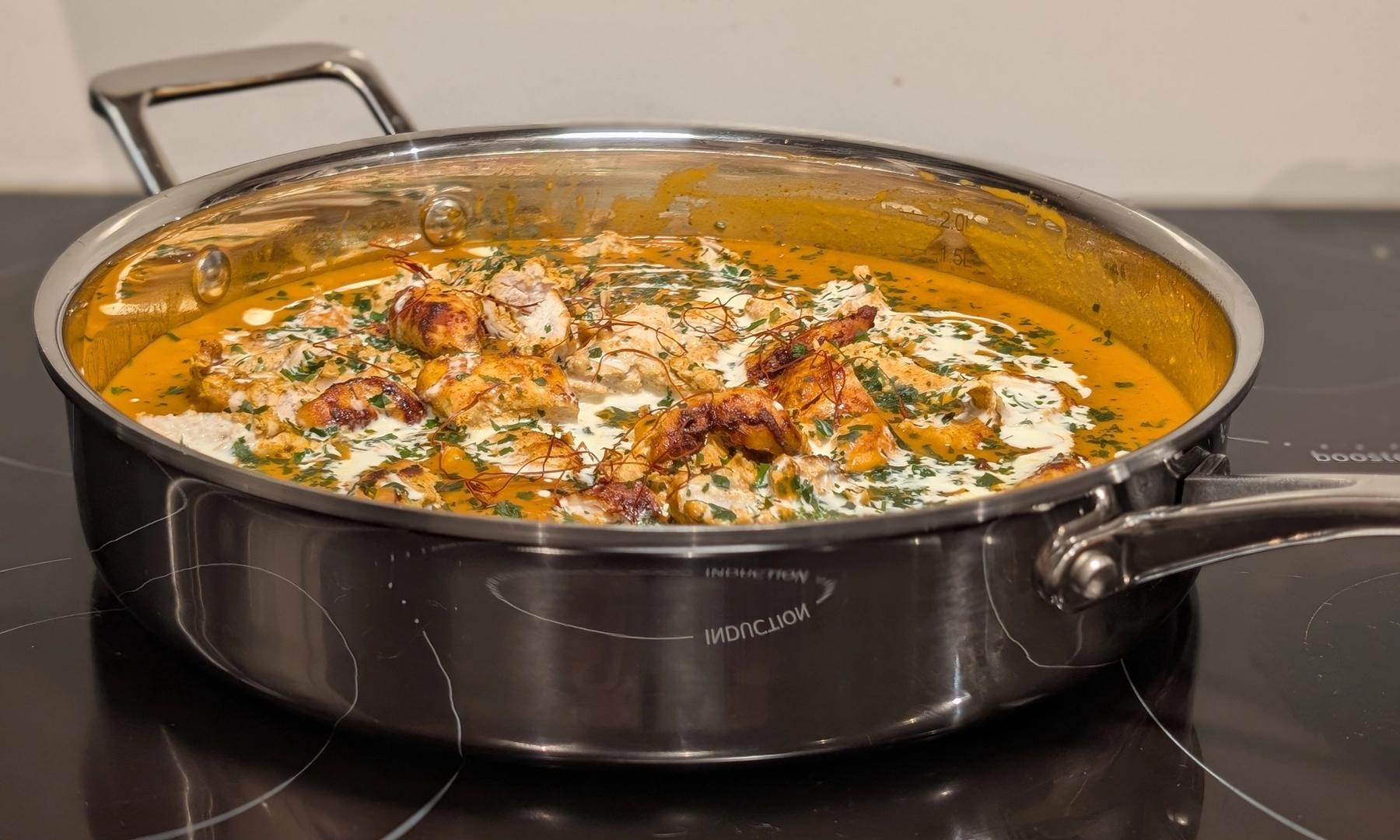 Scanpan Fusion 5 är ett köksredskap som osar kvalitet. Den har en volym på 3 liter och är perfekt för allt från vardagsmiddagar till långkok och festmåltider. Det är även den ni ser på bilderna ovan, se hur snyggt du kan presentera en måltid (som jag gjort på bild 3 här i inledningen 😄). Det är förresten en typisk indisk gryta som heter Murgh Makhani, eller Butter Chicken som den ofta refereras till.