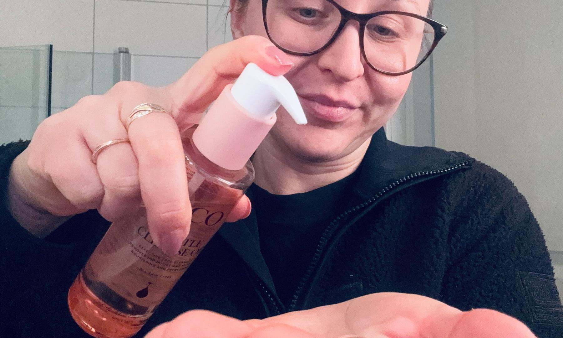För mig räcker 2 pumpar gott och väl till ansikte och hals. Sedan följer jag upp med en vattenbaserad rengöring som löddrar. Den är lite rinnig, vilket gör att man lätt kan spilla och drälla omkring sig.