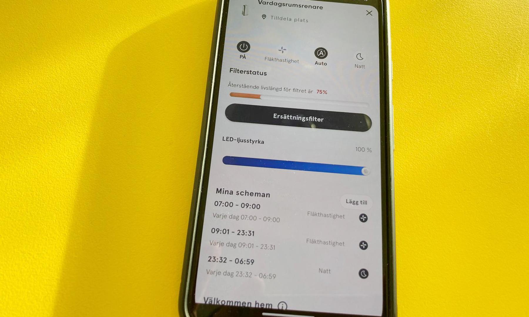 Genom appen kan du ställa in vilka tider luftrenaren ska vara igång, vilka tider den ska vara avstängd och när du vill att den ska gå på låg fart (kan vara bra när du sover). I appen kan du även se nivå på partiklar, luftfuktighet och temperatur.