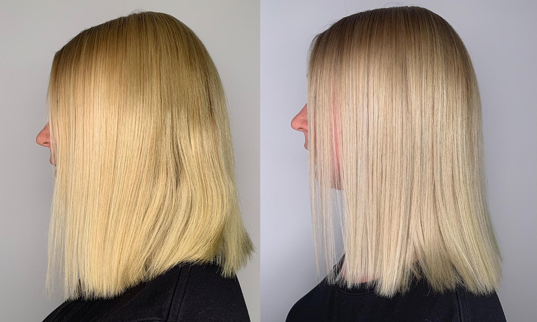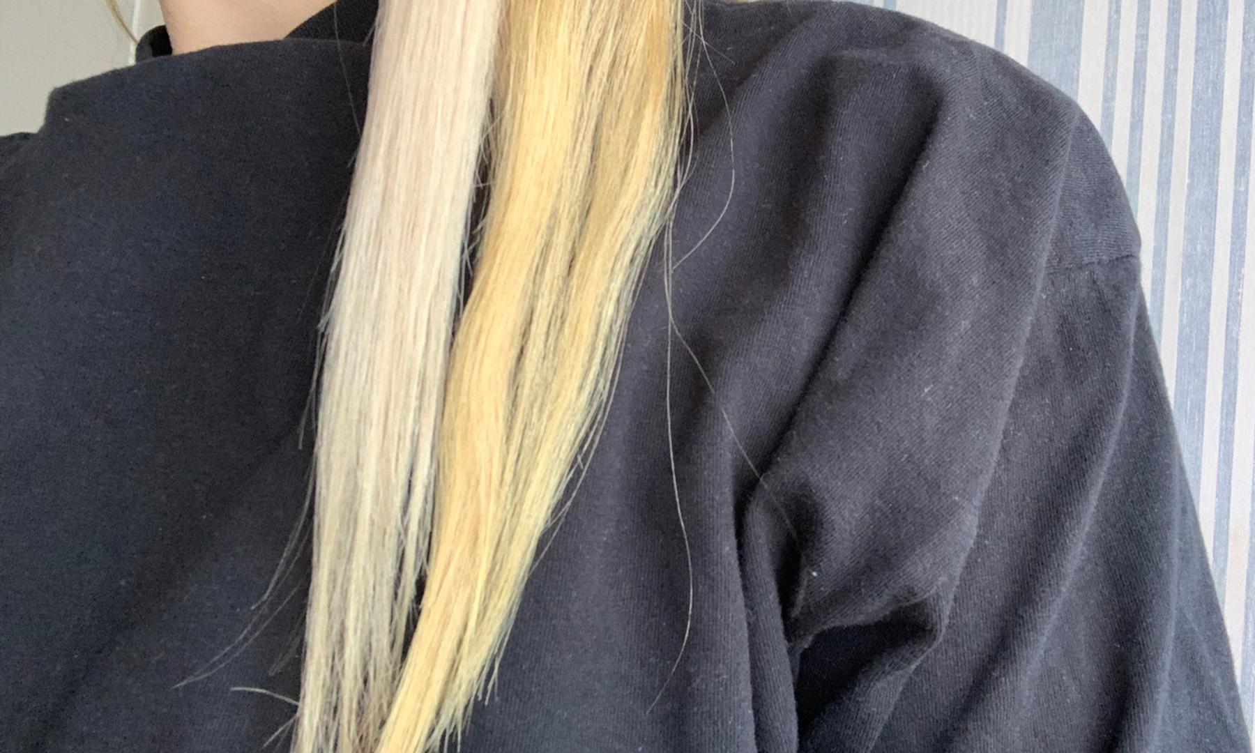 Jag blonderar mitt hår med jämna mellanrum men efter ett tag drar sig färgen alltid åt det gula hållet vilket jag verkligen inte vill. Varför blir håret gult då? Jo, när man lägger en toning så fäster nyansen endast på det yttre skiktet på hårstrået. Detta gör att det successivt kommer att tvättas bort. Ju mer skadat hår man har desto fortare försvinner nyanseringen. Att gå till frisören varje gång färgen börjar gå mot det gula skulle aldrig funka för mig, varken ekonomiskt eller tidsmässigt. Så dessa schampon är ett MÅSTE för mig att ha hemma! Så fort jag börjar se att det börjar skifta i gult kör jag en omgång. Det hjälper nyansen att hålla i sig, och det kan gå längre tid mellan blekningarna vilket sparar på hårkvalitén. Nedan ser ni skillnaden på slingorna där jag använt silverschampo på ena delen, och inte på den andra. Man ser en tydlig skillnad efter bara EN användning! Ja, ni ser ju, MAGI! ⭐